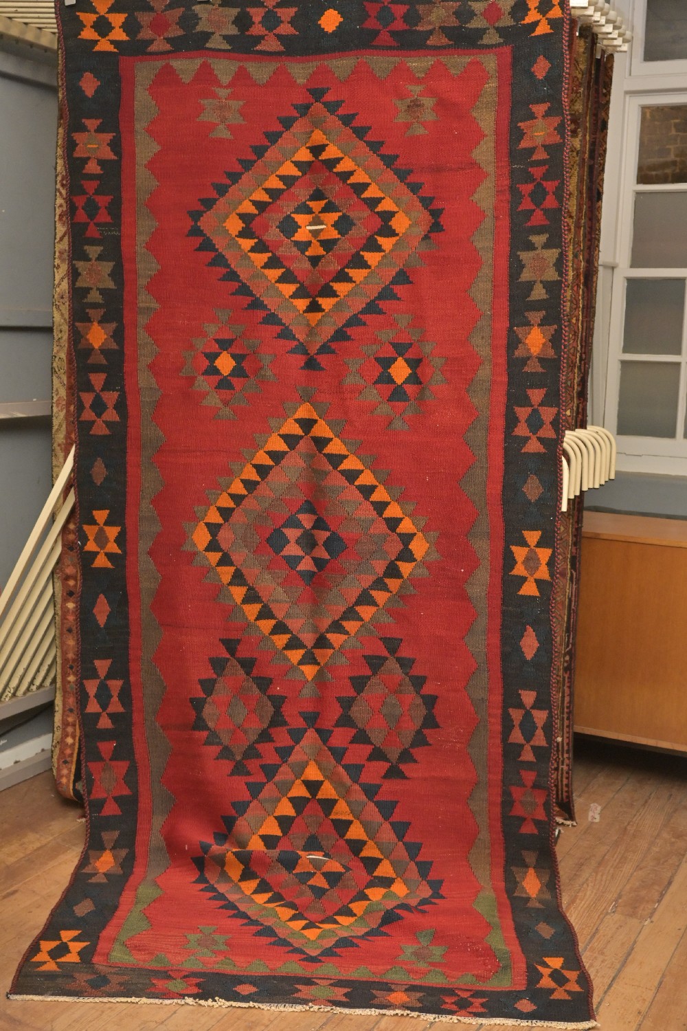 PERSIAN KURDISH KILIM, GEOMETRIC NOMADIC DIAMOND MOTIFS, 100% VEGETABLE DYES, WOOLLEN WEAVE. SIZE: 330 X 143 CM ORIGIN: IRAN– RRP: $750