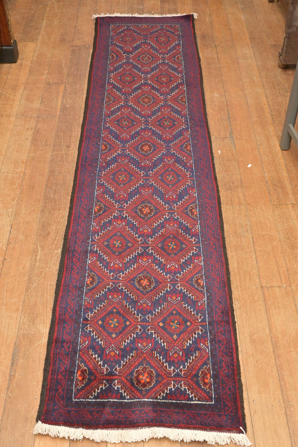A SOLID PERSIAN TURKOMAN BALOUCH RUNNER, FROM THE KHORASAN PROVINCE, 100% PLUSH WOOL PILE. FINELY HAND-KNOTTED TRIBAL WEAVE WITH TRADITIONAL DESIGN OF ALL OVER DIAMOND TURKOMAN MOTIFS SET WITHIN A NAVY FIELD. BORDER OF GEOMETRIC DESIGNS IN PRISTINE CONDITION. SIZE: 274 X 61 CM ORIGIN: PERSIA – RRP: $1,500 DOCUMENTATION OF AUTHENTICITY INCLUDED.