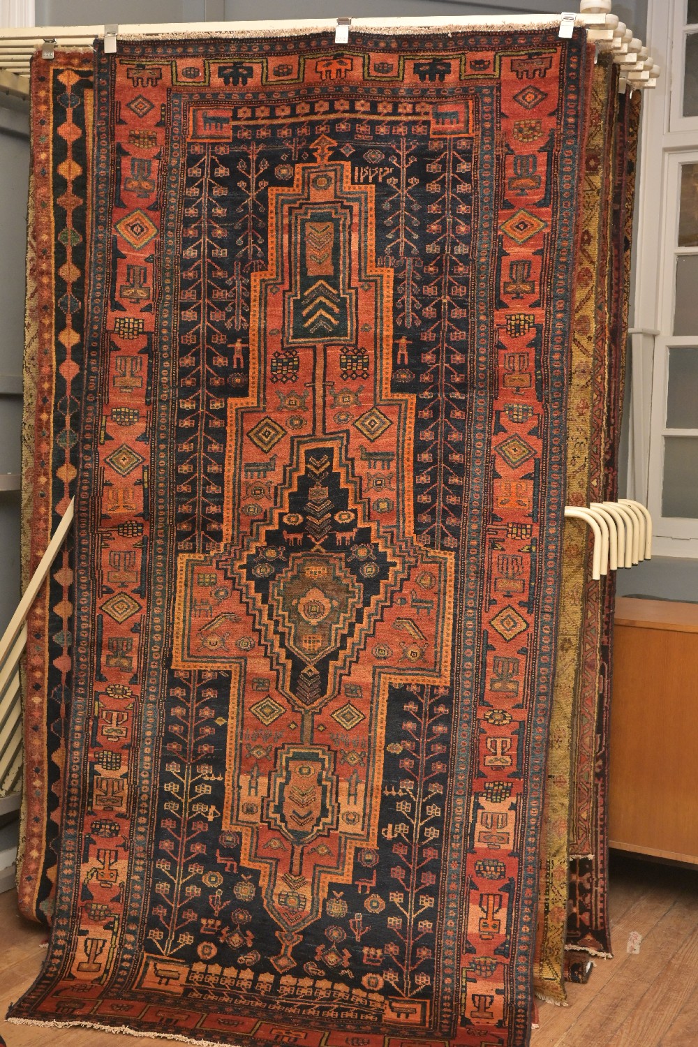 A TRIBAL PERSIAN MALAYER RUG. 100% HAND SPUN WOOL. HAND-KNOTTED VILLAGE WEAVE WITH TRIBAL DESIGN OF BOLD ANCHORED MEDALLION FILLED WITH TRIBAL MOTIFS ON A CHARCOAL FIELD OF TREE OF LIFE, ANIMAL GEOMETRIC MOTIFS. BORDER OF INTERESTING TRIBAL MOTIFS AND ROSETTES. SIZE: 280 X 130 CM ORIGIN: PERSIA – RRP: $2,800 DOCUMENTATION OF AUTHENTICITY INCLUDED.