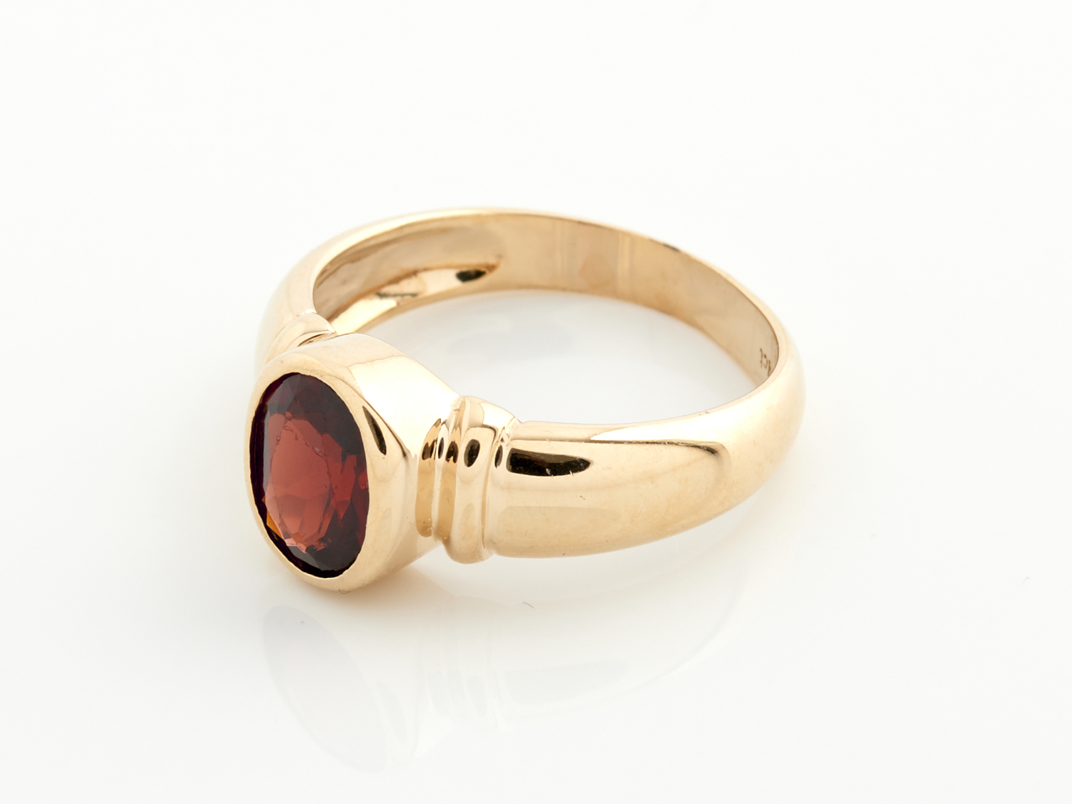 A GARNET RING IN 9CT GOLD, SIZE P, 4.07GMS
