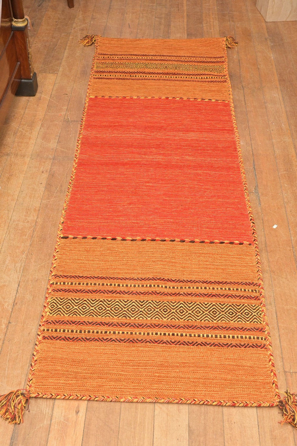 A LARGE COLOURFUL, DENSELY HAND- WOVEN RAJASTHANI KILIM RUNNER. REVERSABLE, MADE FROM THE FINEST COTTON FLEECE. IN RED/ORANGE TONES. SIZE: 250 X 80 CM-ORIGIN: JAIPUR – RRP: $500