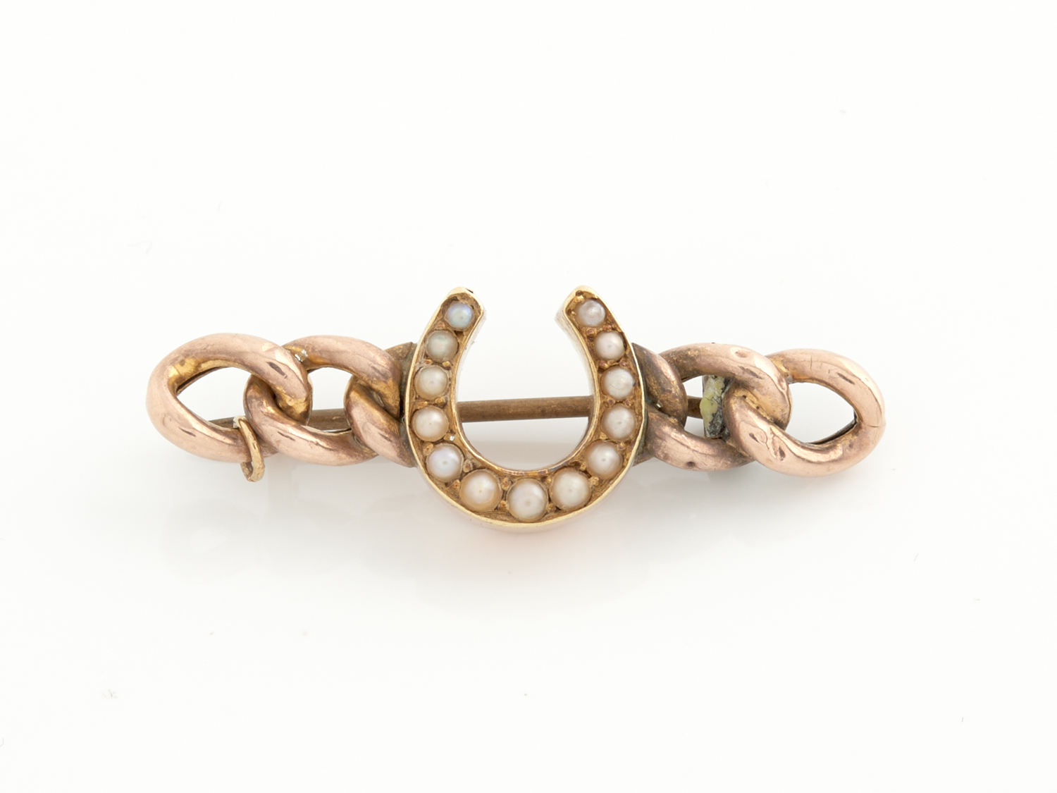 A VICTORIAN NATURAL SEED PEARL HORSESHOE BROOCH IN 9CT GOLD, 40 x 12MM, 2.9GMS