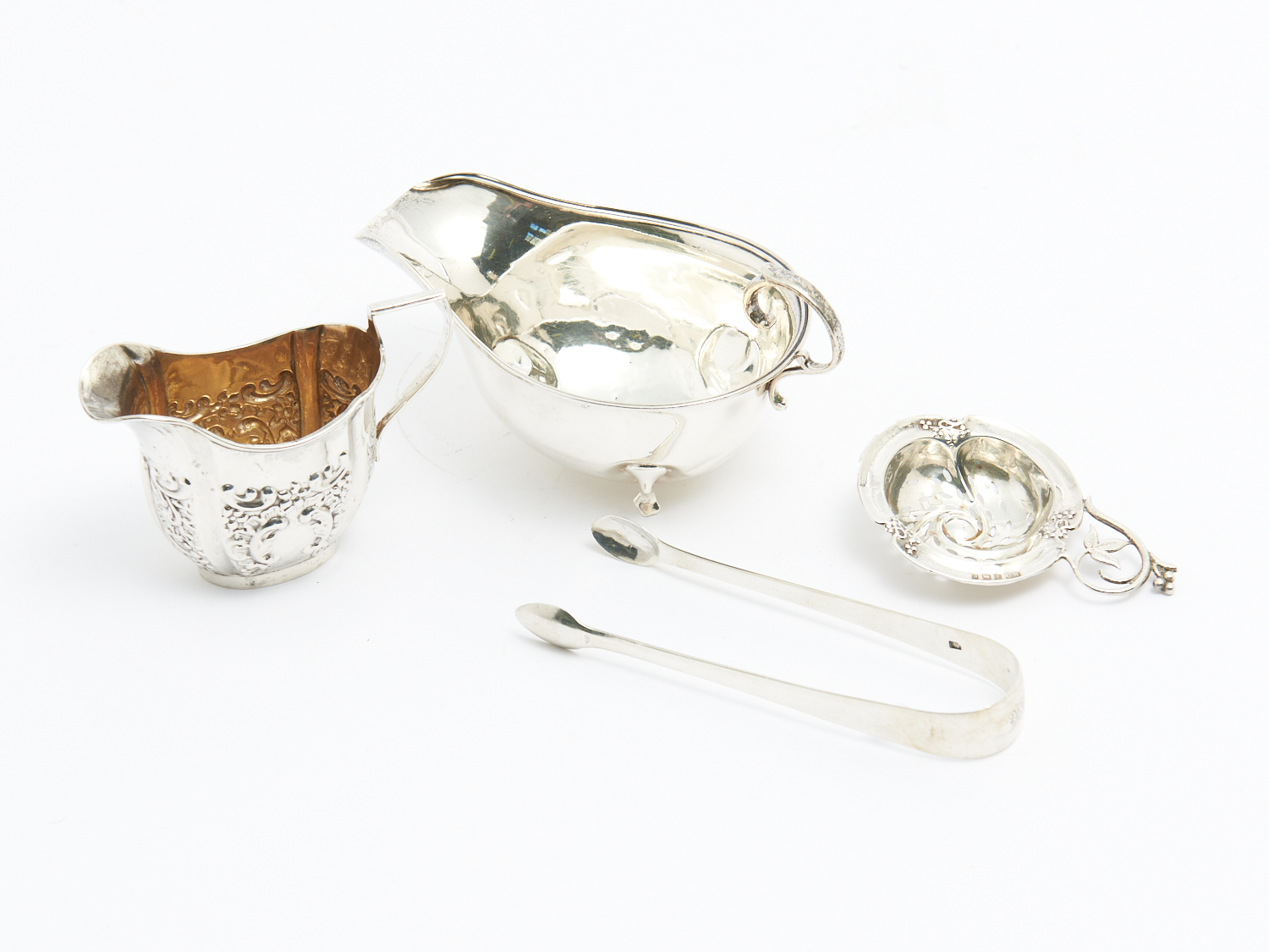 A GROUP OF STERLING SILVER ITEMS INCL. TWO POURERS, A PAIR OF TONGS AND A STRAINER 190G L.15CM (LONGEST), LEONARD JOEL DELIVERY SIZE: SMALL