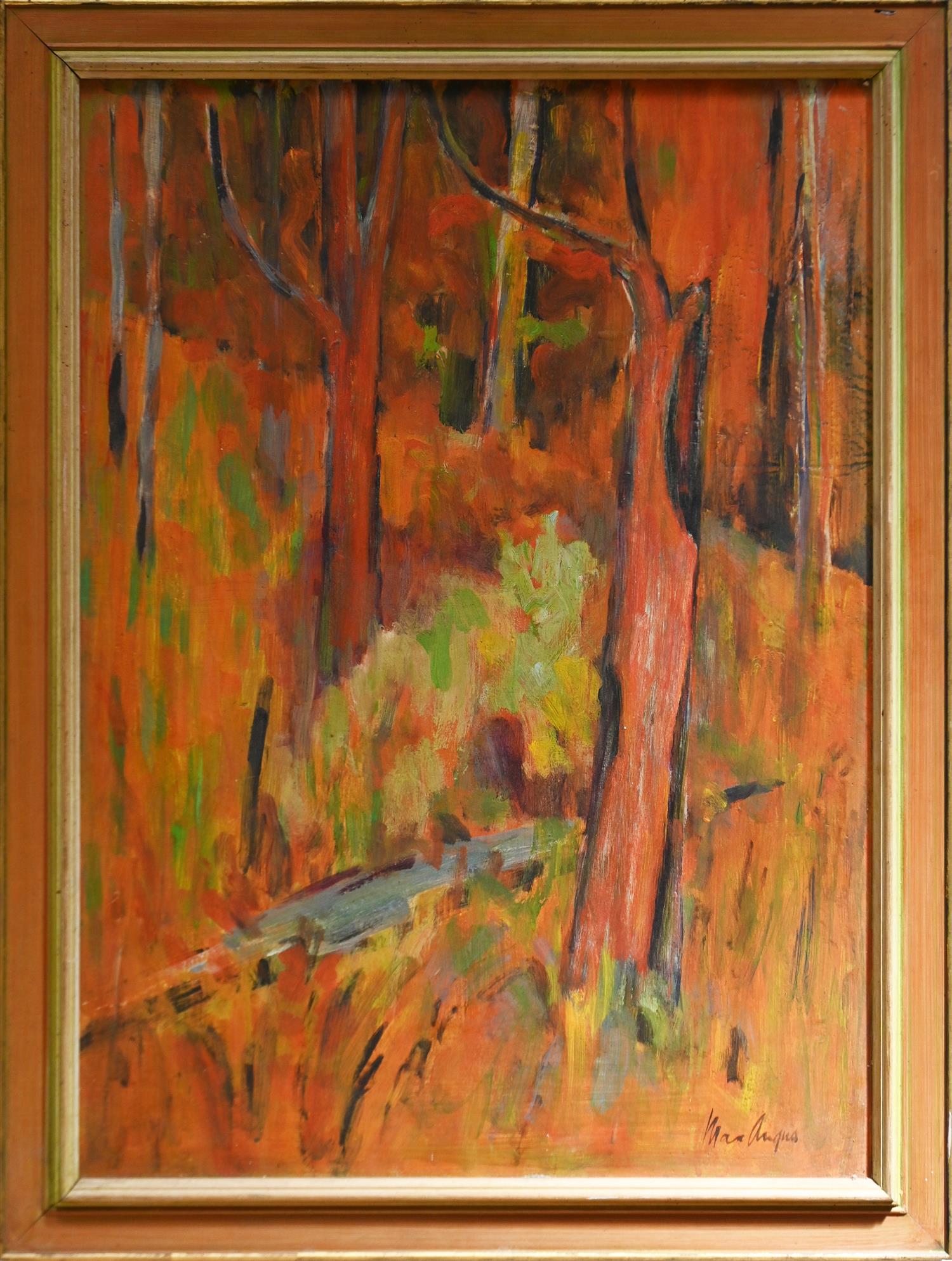 MAX ANGUS, AWAITING FIRE, OIL ON BOARD, SIGNED LOWER RIGHT, TITLE INSCRIBED VERSO, 72 X 52CM, FRAME SIZE: 84 X 63CM