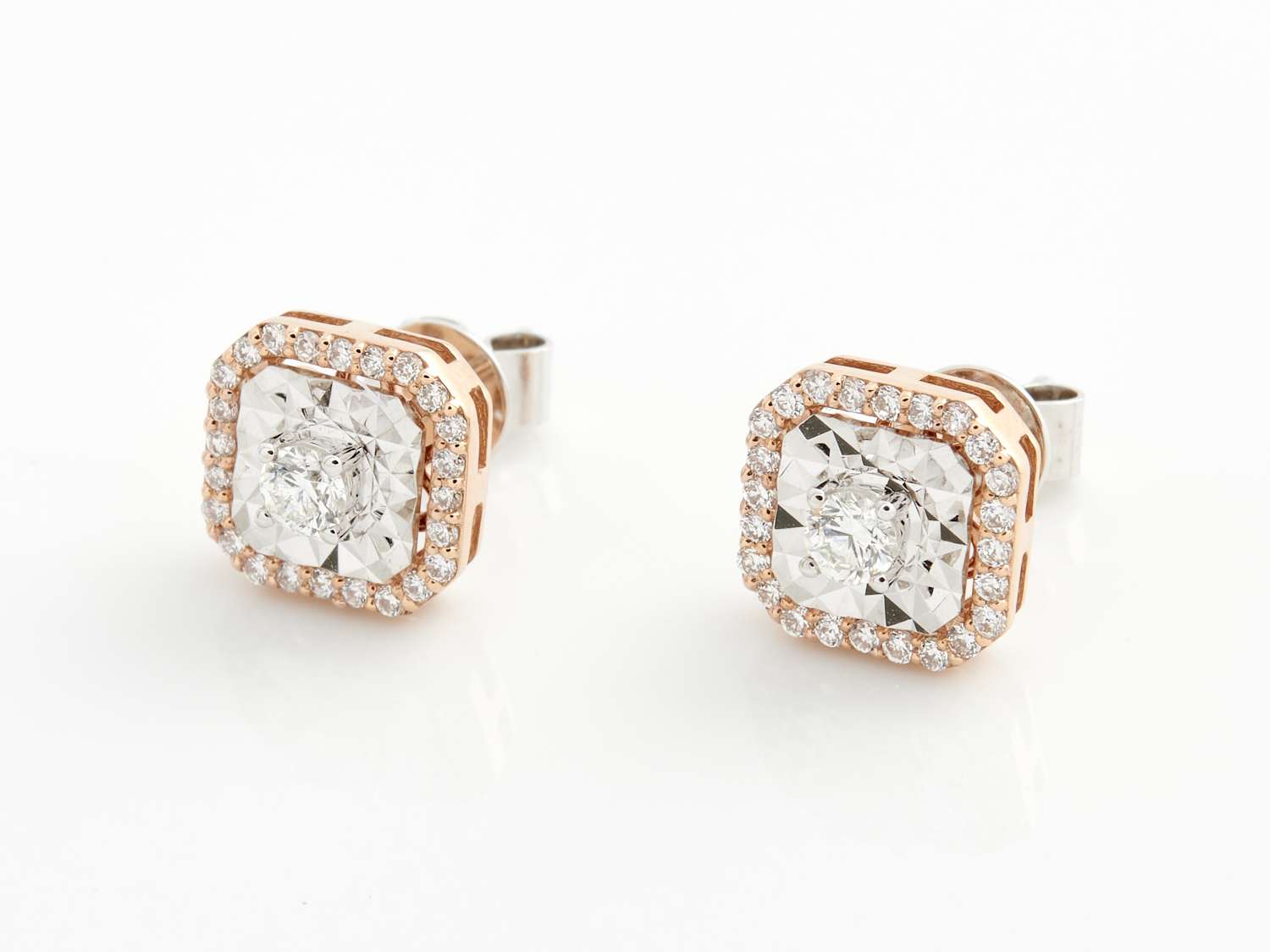 A PAIR OF DIAMOND CLUSTER EARRINGS IN 18CT TWO TONE GOLD, TO POST AND BUTTERFLY FITTINGS, THE DIAMONDS TOTALLING 0.3CTS, 2.5GMS