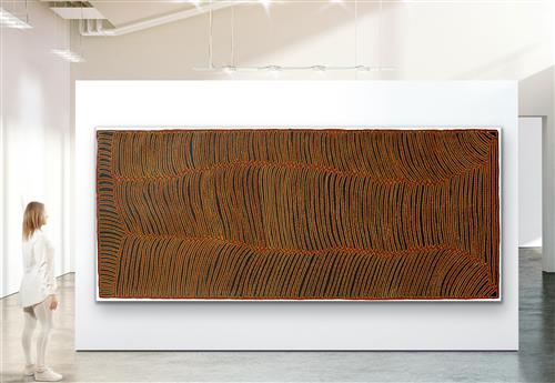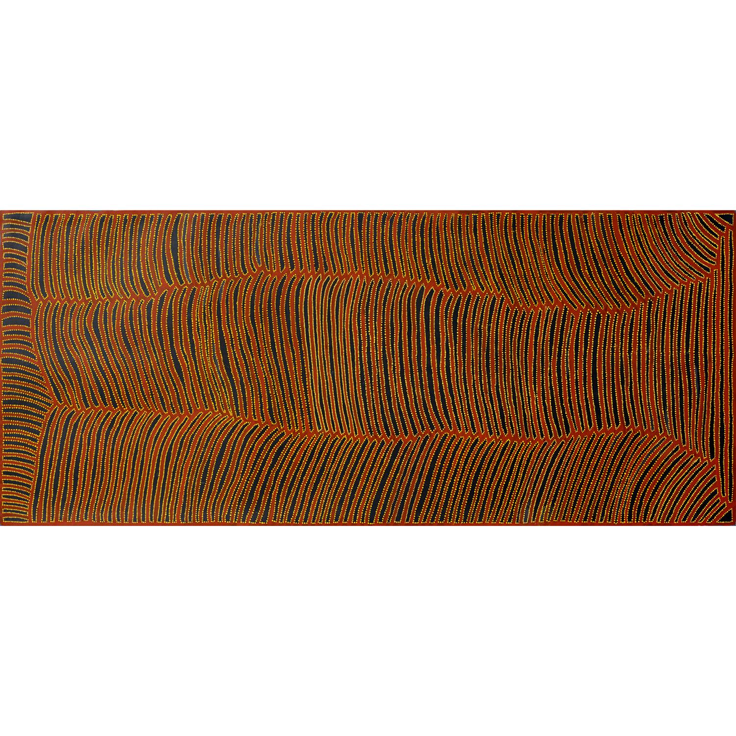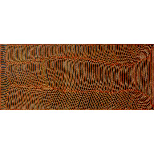 "The lines on this canvas derive from the body paint design applied as part of the "awelye" (ceremony) Gloria Petyarre has custodial responsibility for this very individual species. In ceremony, she dramatically recalls through song and dance, those characteristics of the mythological mountain devil women that made her an individual and tough survivor.