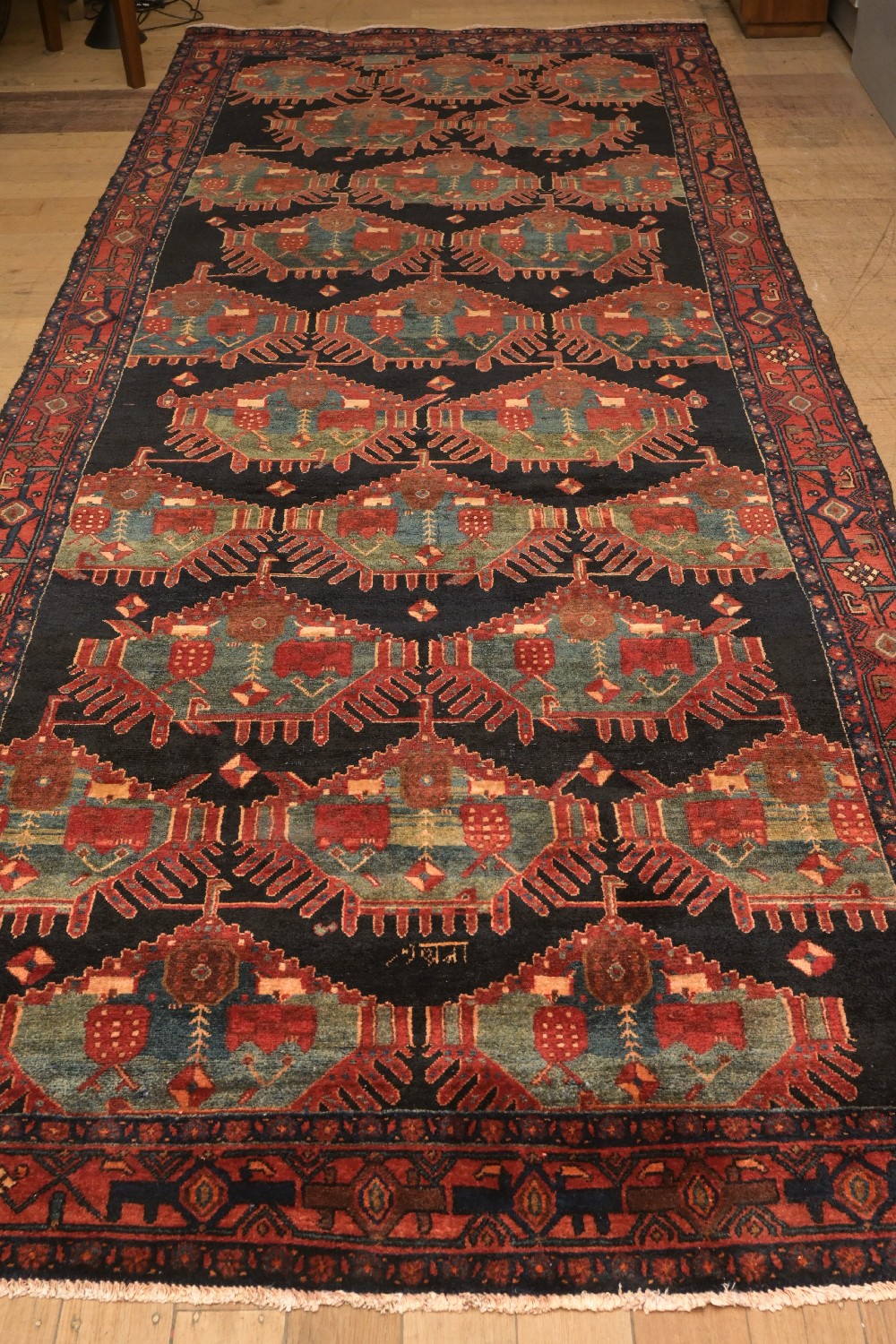 AN OUTSTANDING SEMI-ANTIQUE BIDJAR TEKKENTEPPE KELEGI RUG. 100% WOOL. NATURAL DYES. HAND-WOVEN & INSCRIBED BY A FEMALE WEAVER "MARYAM" AND DATED "1967". RARE DESIGN OF ALL-OVER STYLIZED TRIBAL SYMBOLS IN VIBRANT NATURAL TONES SET WITHIN A CHARCOAL-TONED FIELD. (400 X 150CM)(LEONARD JOEL DELIVERY SIZE: LARGE)