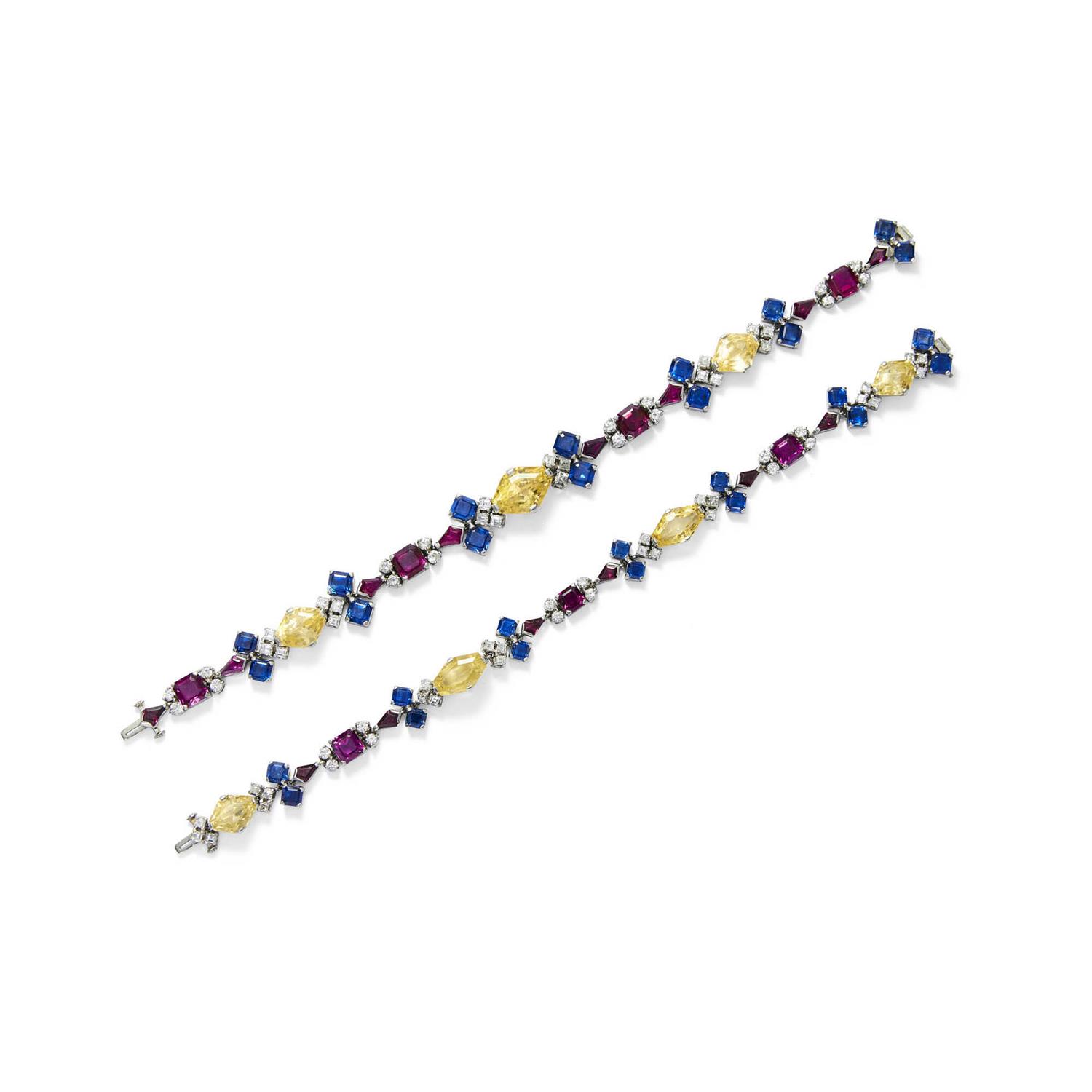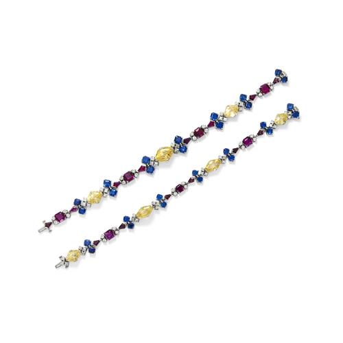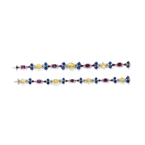 FANCY COLOURED SAPPHIRE, RUBY AND DIAMOND NECKLACE-BRACELET COMBINATION, CIRCA 1940