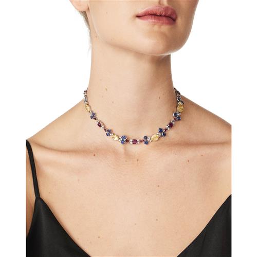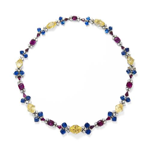 Of geometric design, composed of a line of claw-set variously-shaped yellow sapphire, blue sapphire and ruby together weighing approximately 62.39 carats between carré and brilliant-cut diamond accents, completed by a box clasp, the diamonds together weighing approximately 3.12 carats, mounted in platinum, inner circumference 370mm, necklace detaches into sections measuring 185mm and 180mm, numbered.