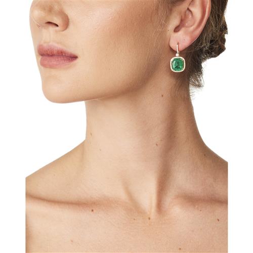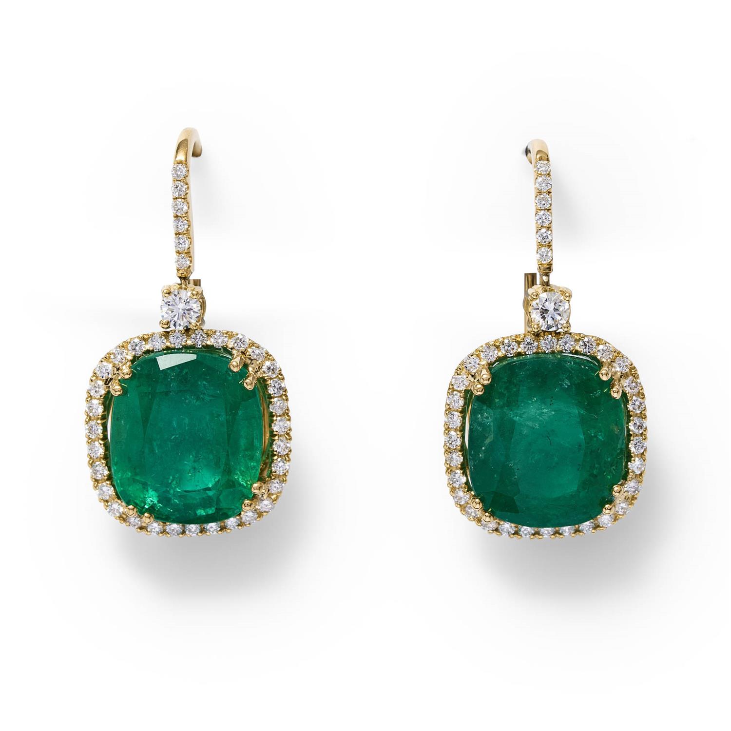Each of cluster design, terminating on a claw-set cushion-shaped emerald swing drop framed by a halo of pavé-set brilliant-cut diamonds, surmounted by an ear wire similarly set to the front with diamonds between a claw-set diamond connector, the emerald and diamonds together weighing approximately 13.75 carats and 0.50 carats respectively, mounted in 18ct gold, length 28mm, shepherd hook fittings.