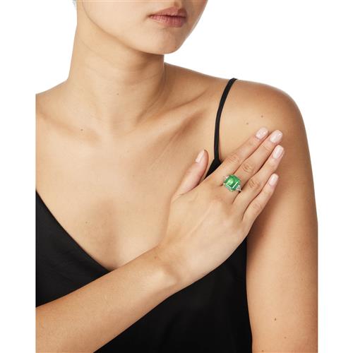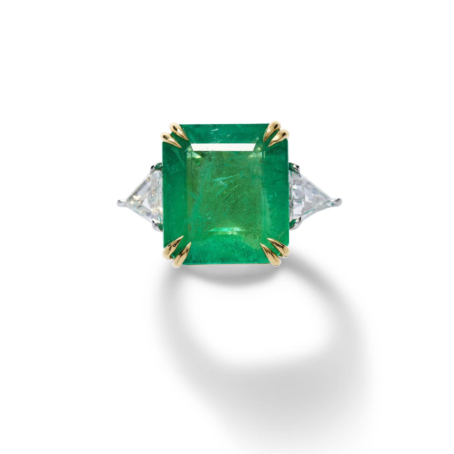 The octagonal-shaped emerald weighing approximately 11.70 carats, is claw-set between a pair of trilliant-cut diamonds together weighing approximately 1.02 carats, mounted in platinum and 18ct gold, size M1/2.