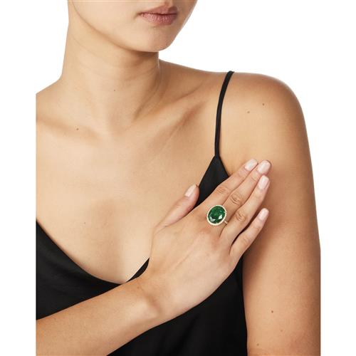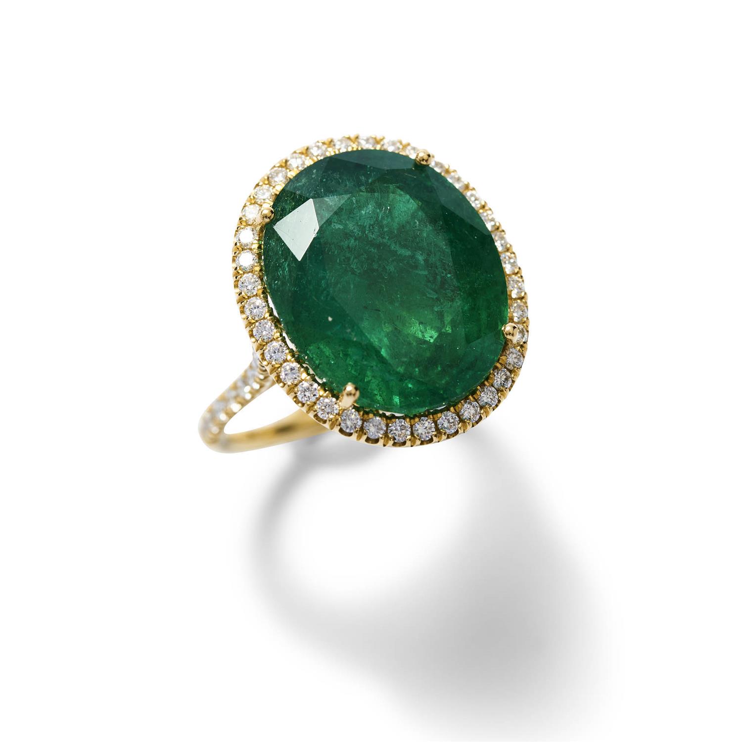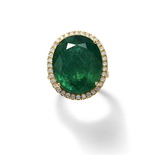 Of cluster design, centring a claw-set oval emerald weighing approximately 17.11 carats, framed by a halo of brilliant-cut diamonds, to similarly set shoulders, the diamonds together weighing approximately 0.84 carats, mounted in 18ct gold, size M1/2.