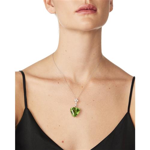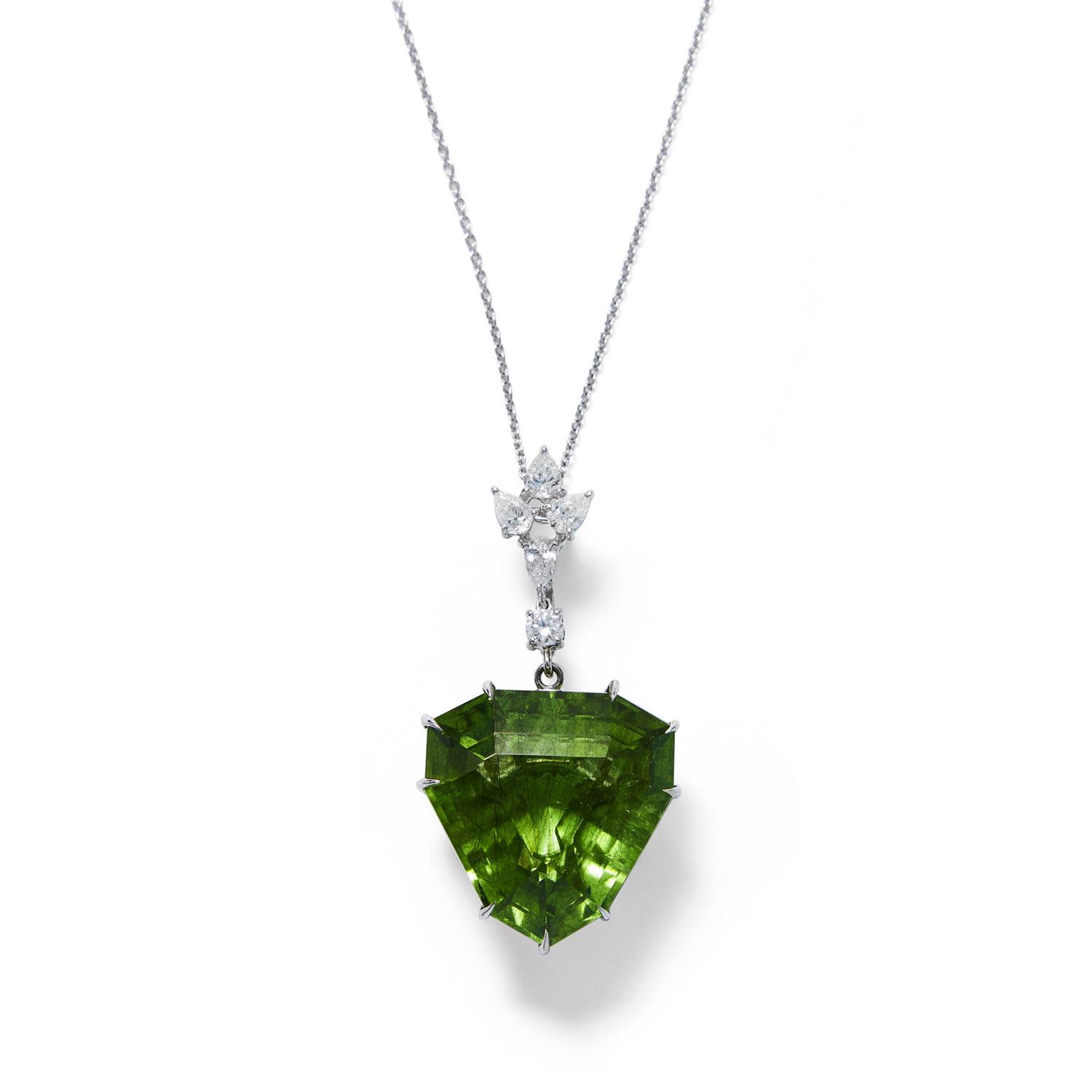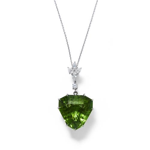 Centring a claw-set shield-shaped peridot weighing approximately 42.38 carats, surmounted by a cluster of pear-shaped diamonds, between a claw-set brilliant-cut diamond connector, supported from a trace link chain, the diamonds together weighing approximately 0.75 carats, mounted in 18ct white gold, pendant length 46mm, inner circumference 450mm, adjustable to 425mm.