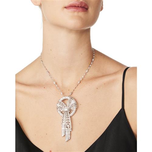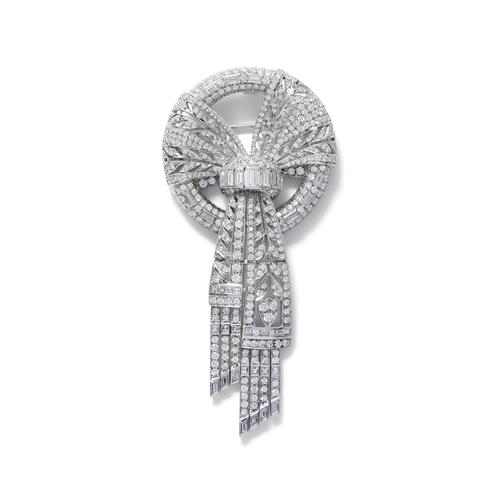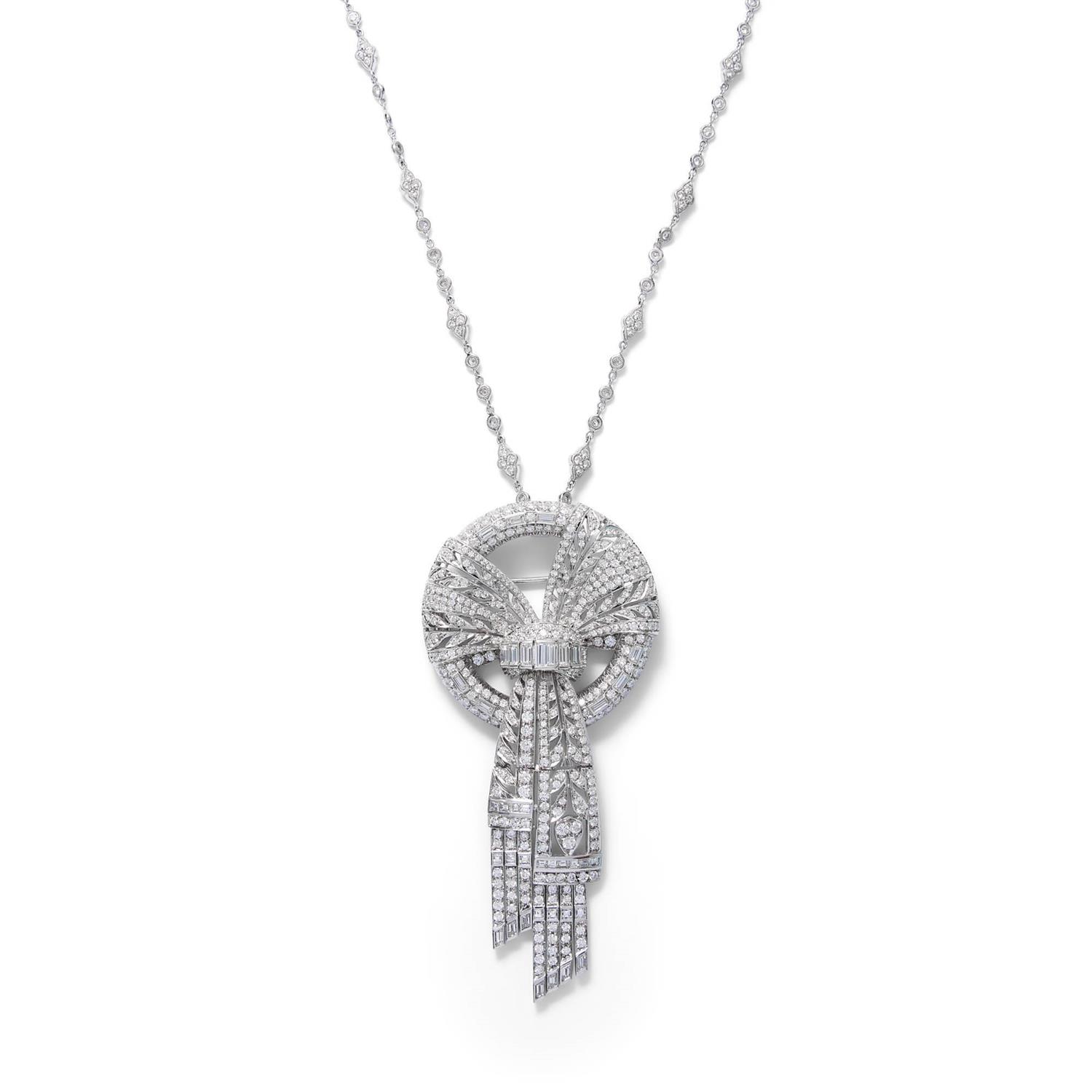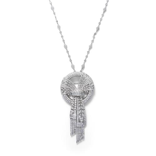 Designed as a half-round annular plaque centring a ribbon-bow terminating in a tassel fringe embellished with carré, baguette and brilliant-cut diamonds, the diamonds together weighing approximately 13.27 carats, supported from a neck-chain decorated at intervals with a geometric motif millégrain-set with diamonds between a line of spectacle-set diamonds, the diamonds together weighing approximately 0.65 carats, inner circumference 420mm, brooch/pendant length 97mm, trombone fitting.