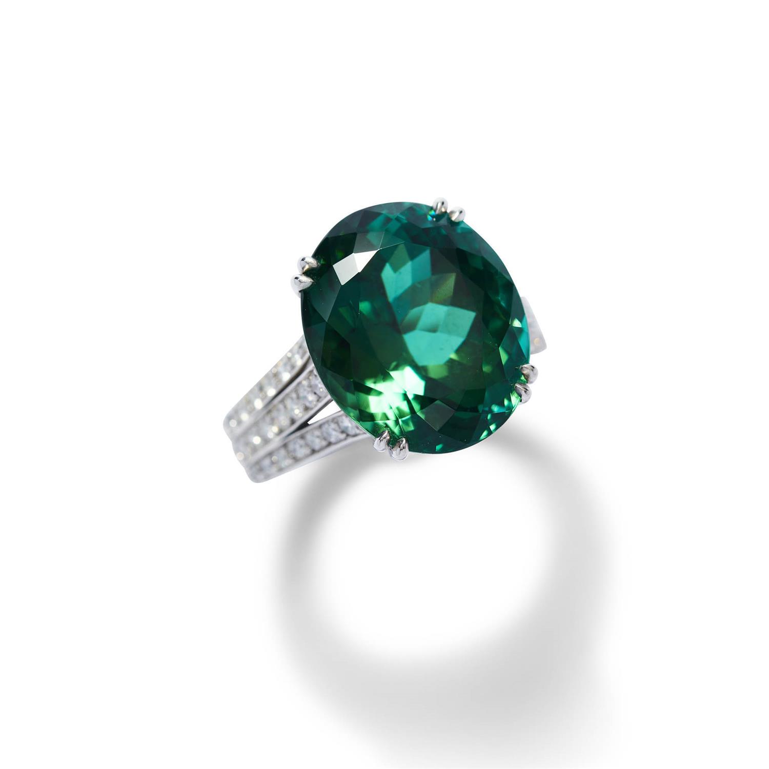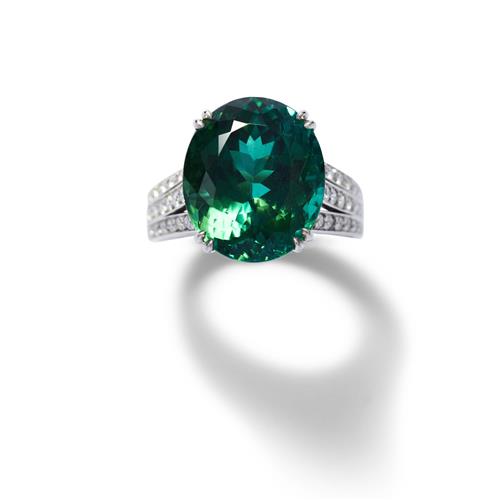The oval tourmaline weighing approximately 13.00 - 15.00 carats is claw-set, to shoulders pavé-set with a triple row of brilliant-cut diamonds, the diamonds together weighing approximately 1.30 carats, mounted in platinum, size M1/2, numbered 1xxxxxx8, signed Tiffany & Co.
