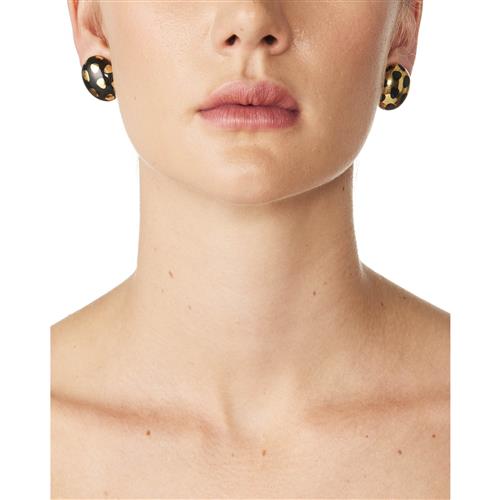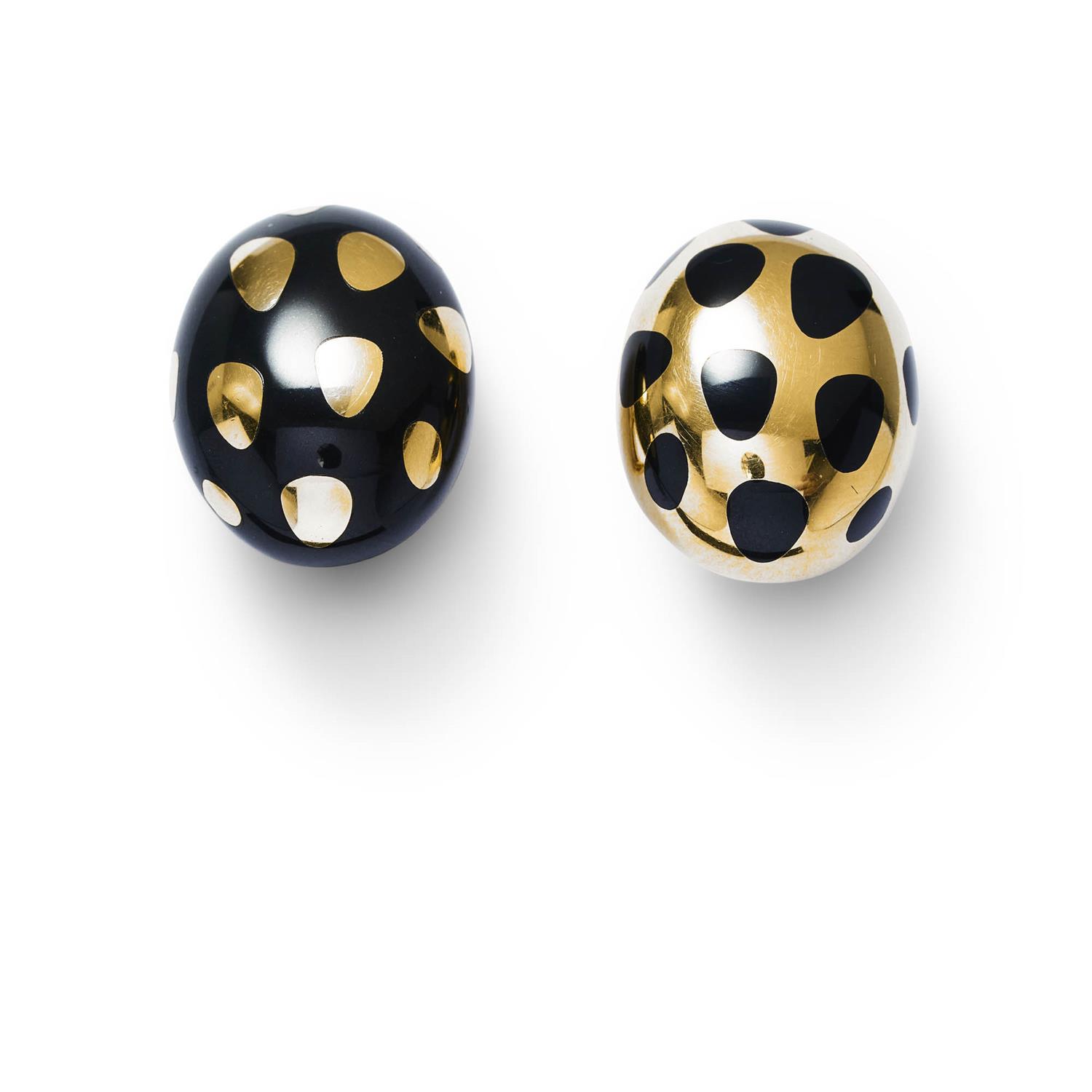 Each of inverse design, modelled as a bombé elliptical plaque, embellished at intervals with freeform gold and black jade accents, length 24mm, width 18mm, post and clip fittings, signed Tiffany & Co.
