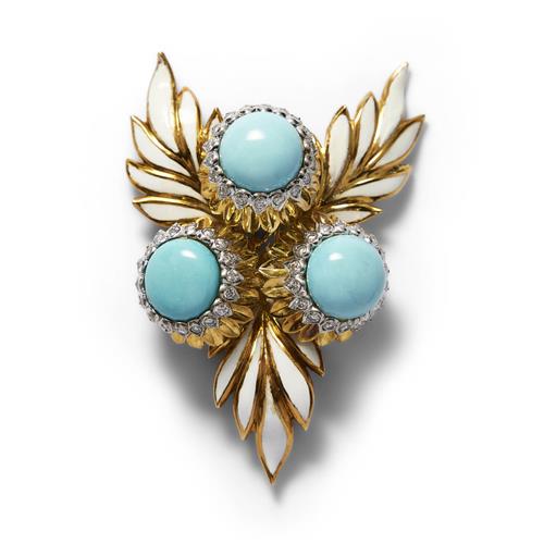 Designed as a floral spray, the buds decorated with circular cabochon turquoise framed by petals embellished with brilliant-cut diamonds between foliate applied with white enamel, the diamonds together weighing approximately 1.62 carats, mounted in 18ct gold, length 71mm, width 48mm, trombone clip fitting, signed Montclair.