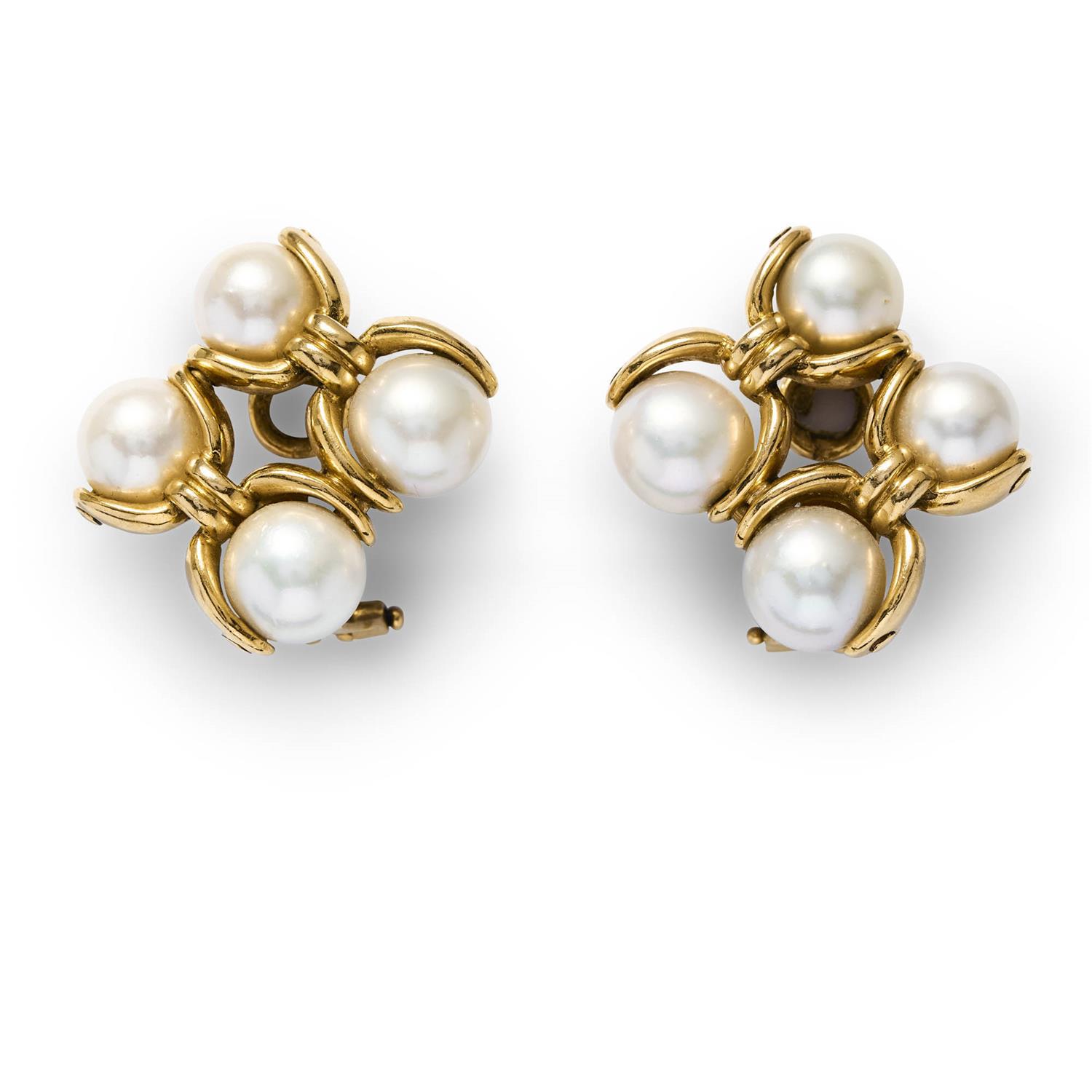 Each of cluster design, centring four cultured pearls measuring 8mm to 9mm framed by a stirrup motif, length 24mm, width 22mm, clip fittings, Italian workshop registration marks, signed G.Petochi.