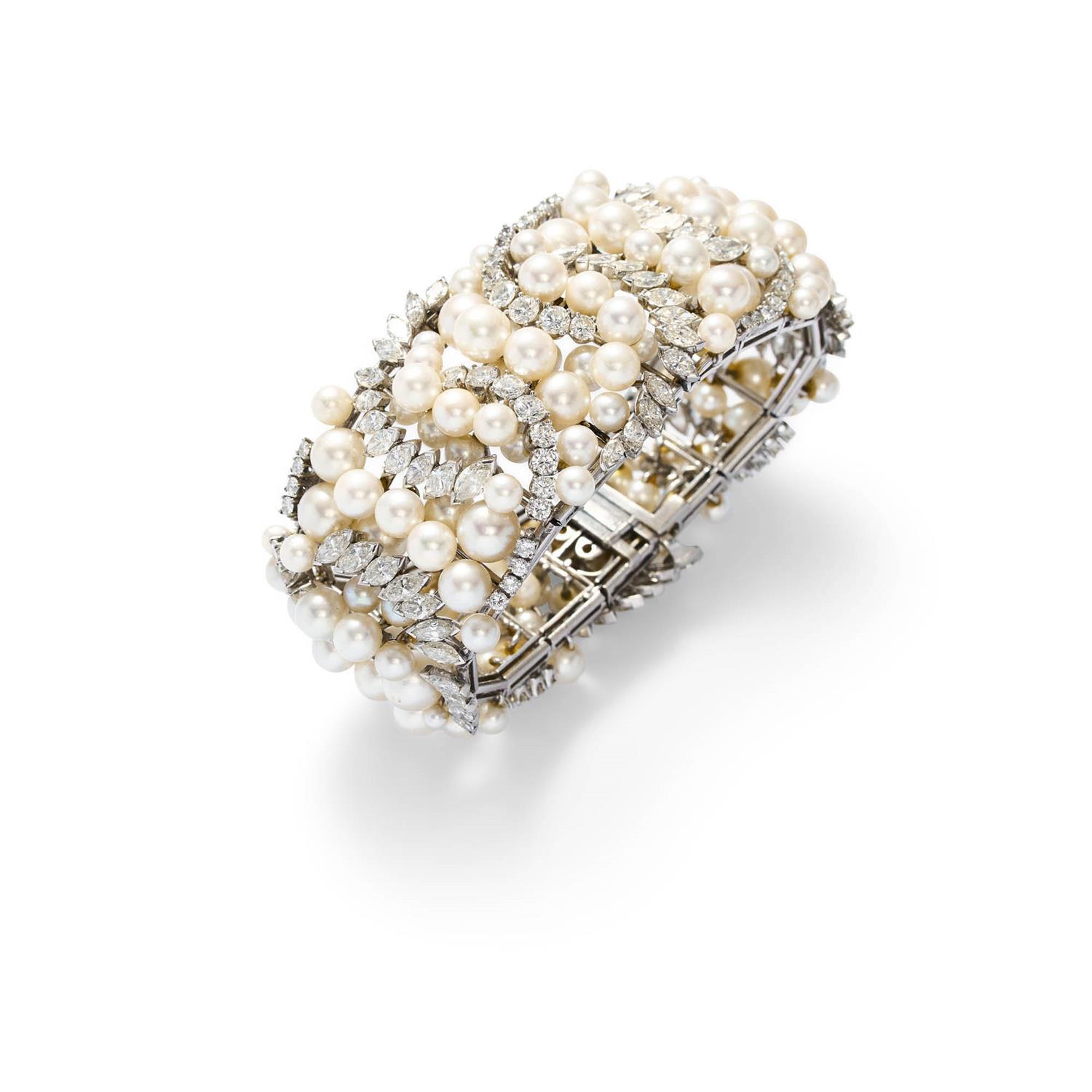 Of foliate design, embellished with round cultured pearls graduating from 3.0mm to 7.5mm framed between lines of graduating brilliant-cut and marquise shaped diamonds, the diamonds together weighing approximately 24.60 carats, mounted in platinum, inner circumference 176mm.