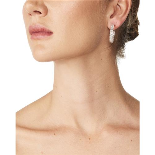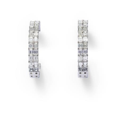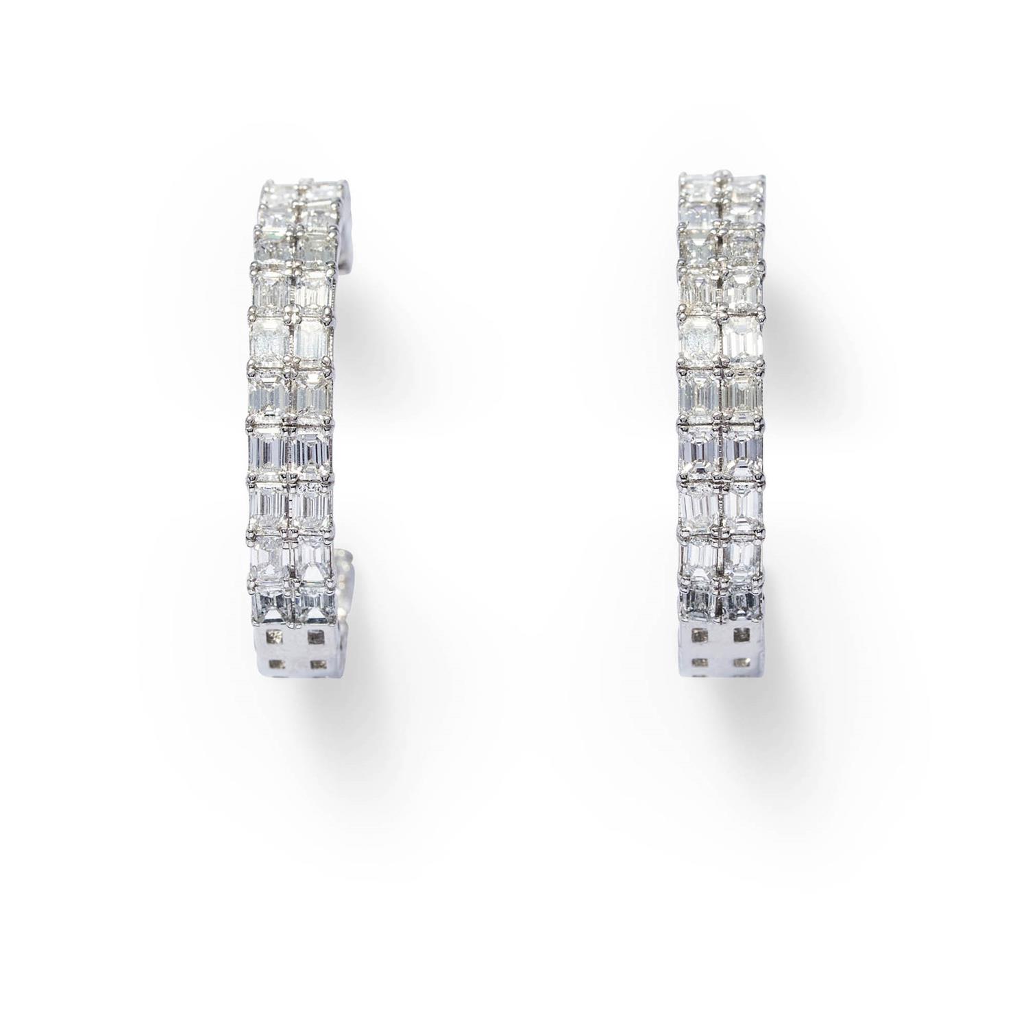 Each circular hoop is claw-set to the front and inside back with a double row of baguette diamonds together weighing approximately 7.33 carats, mounted in 18ct white gold, inner diameter 24mm, post and scroll fittings.