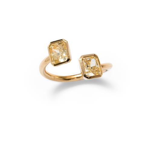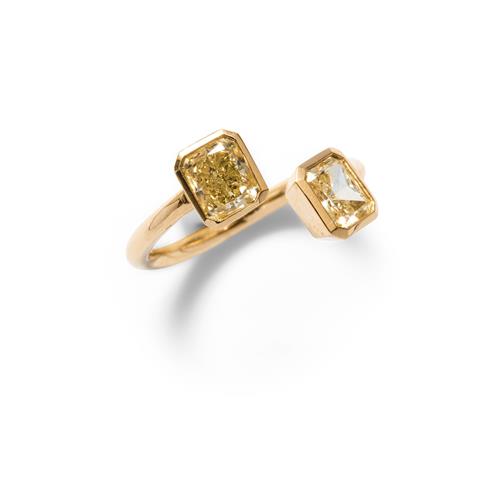 Of toi et moi design, terminating in a collet-set cut-cornered rectangular modified brilliant-cut natural fancy yellow diamond weighing 0.59 carats and a similarly set cut-cornered rectangular modified brilliant-cut natural fancy light yellow diamond weighing 0.55 carats, mounted in 18ct gold, size I1/2.