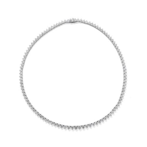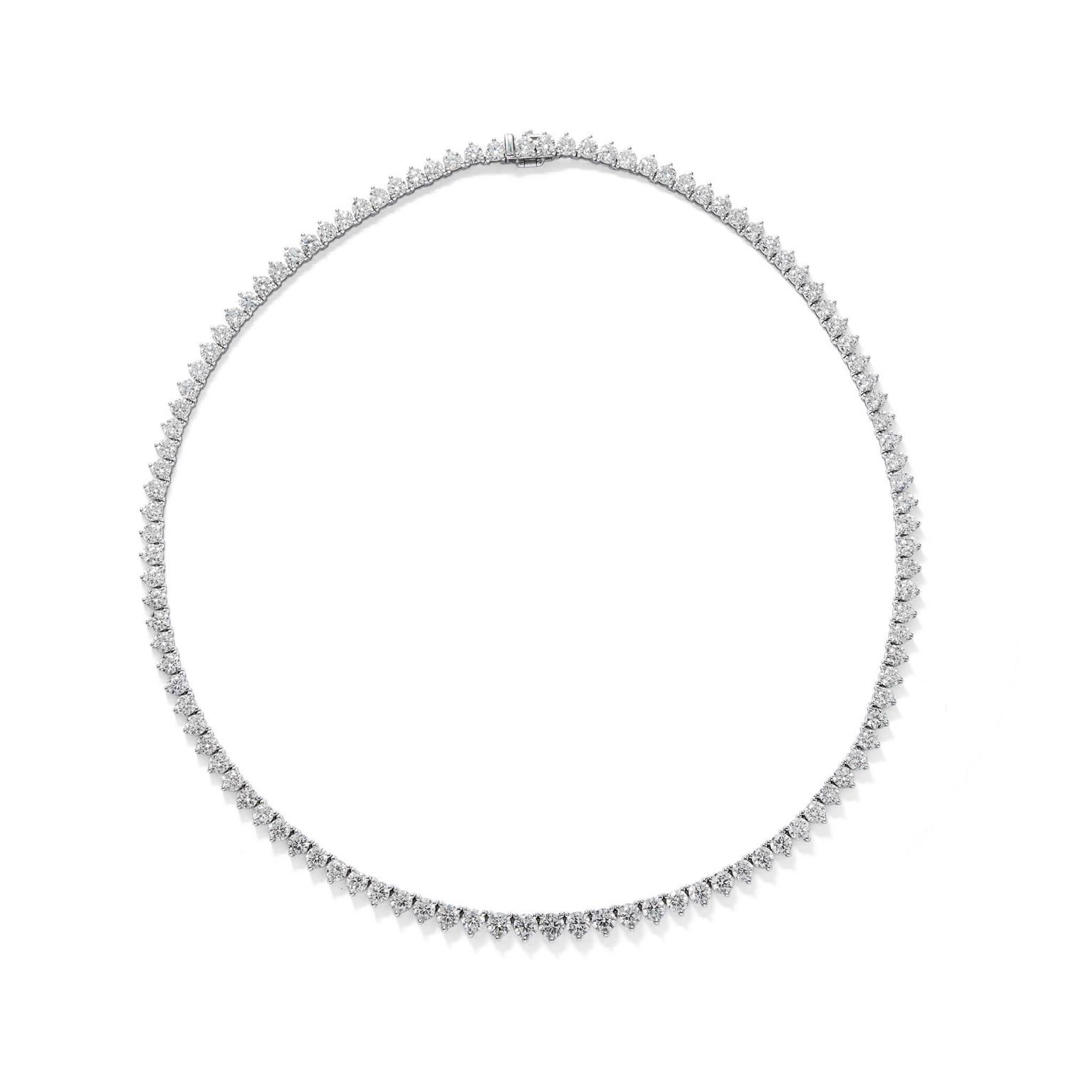Composed of a graduating line of 108 claw-set brilliant-cut diamonds completed by a concealed box clasp, the diamonds together weighing approximately 21.37 carats, mounted in 18ct white gold, length 420mm.