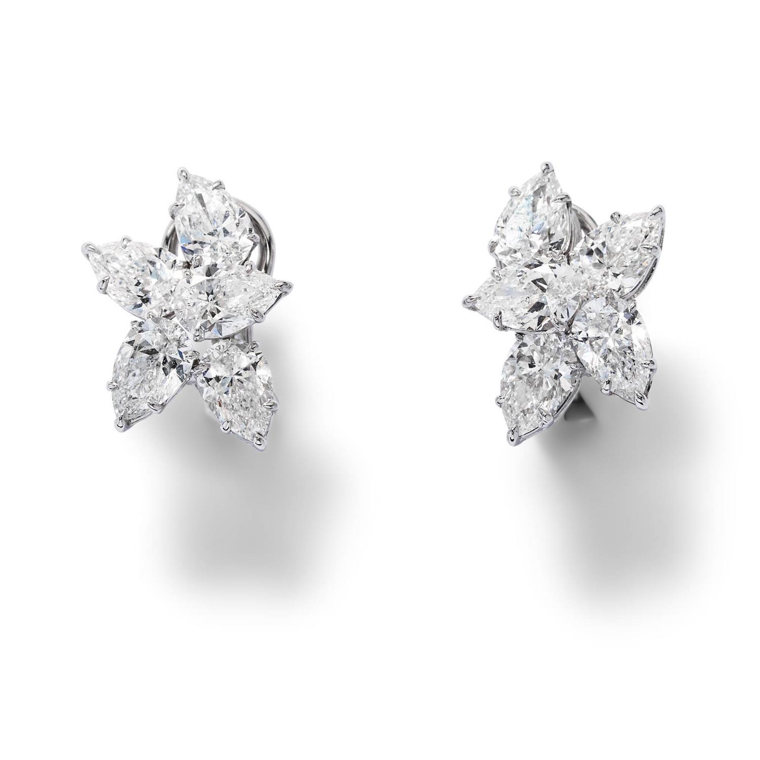 Each of cluster design, claw-set with five pear brilliant-cut diamonds, the diamonds together weighing 7.02 carats, mounted in 18ct white gold, length 20mm, post and clip fittings.