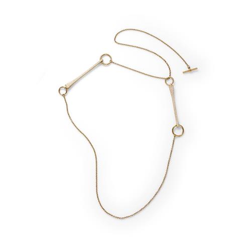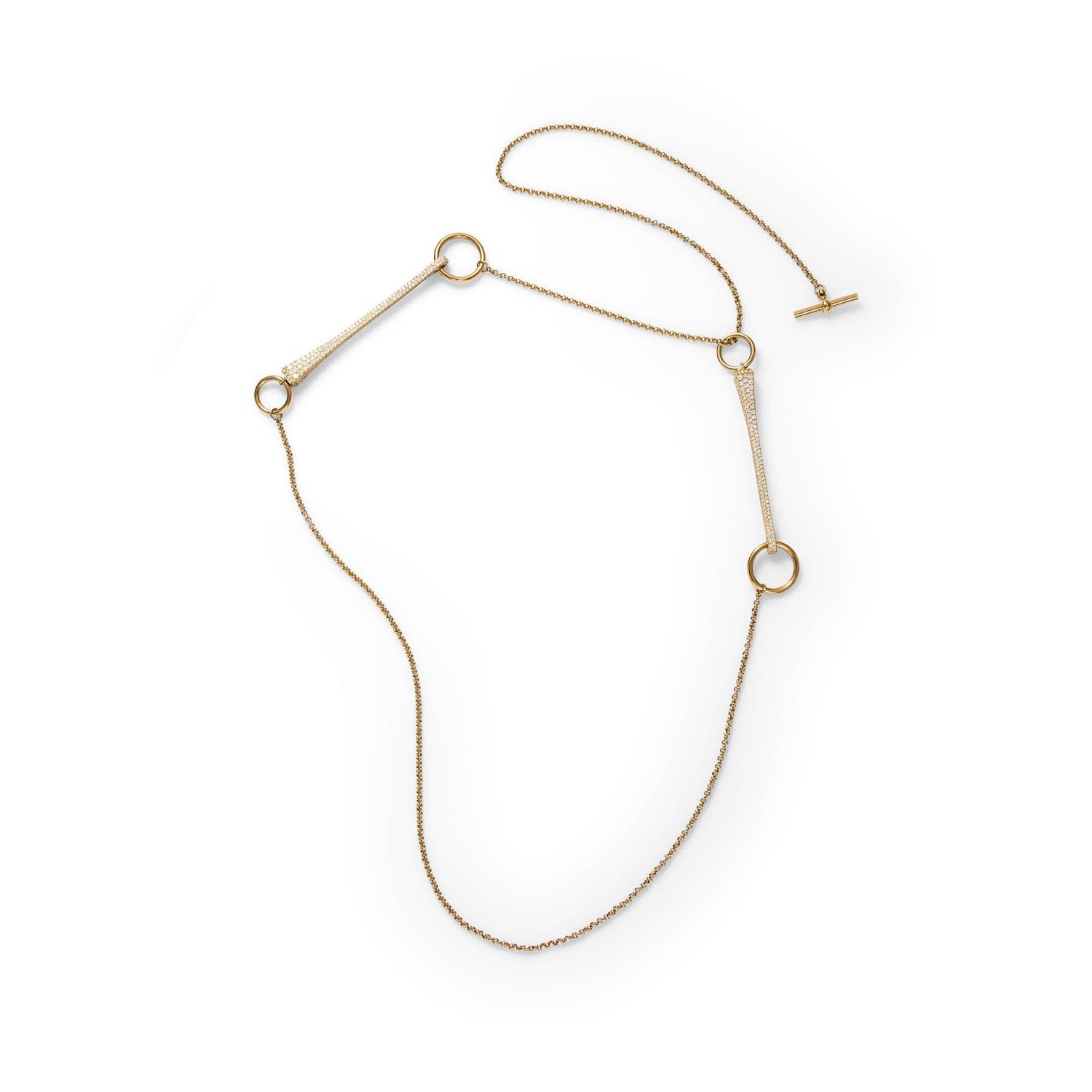 The adjustable necklace is composed of a line of belcher links supporting a pair of stylised horse bits pavé-set to the top with brilliant-cut diamonds, terminating in a toggle swing drop the diamonds together weighing approximately 2.80 carats, inner circumference 800mm adjustable, gross weight approximately 31 grams, French assay marks, numbered 1xxxx8, signed Hermès.