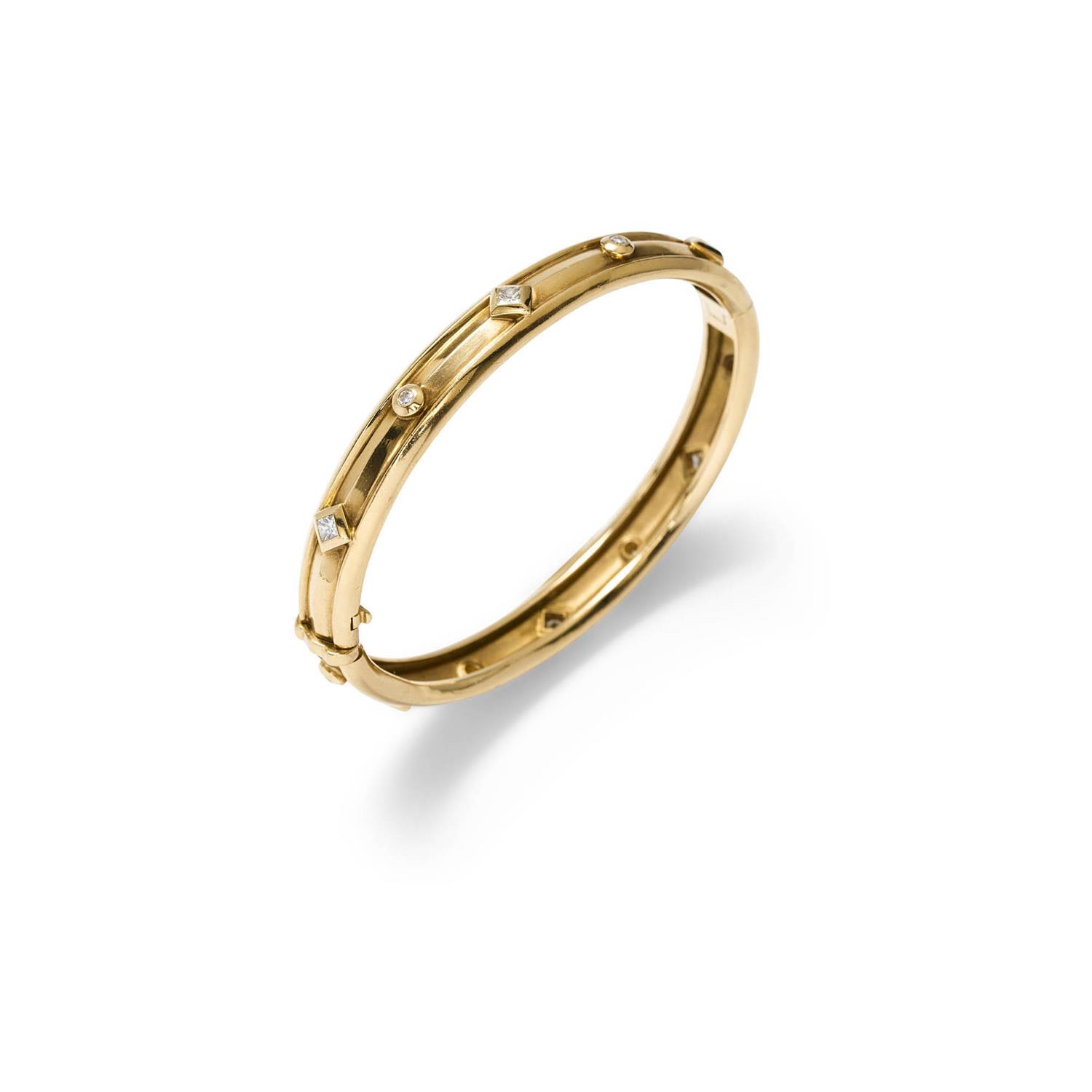 The oval 7.5mm half round hinged bangle is decorated to the obverse and reverse at intervals with collet-set princess and brilliant-cut diamonds, the diamonds together weighing approximately 0.75 carats, gross weight approximately 26 grams, inner circumference 152mm, signed DY for David Yurman.