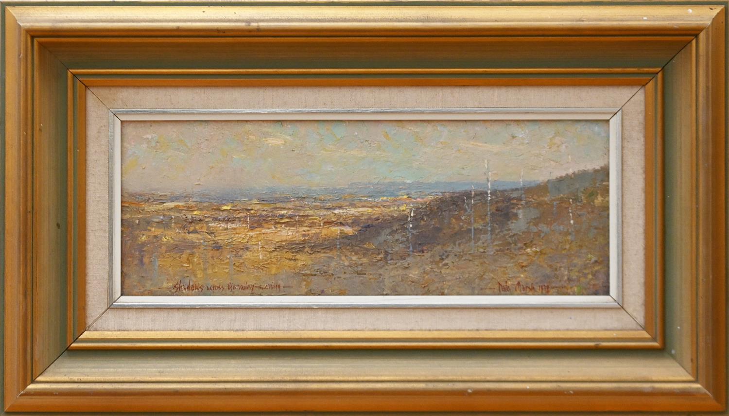 DALE MARSH, SHADOWS ACROSS THE VALLEY MORNING 1979, OIL ON BOARD, SIGNED AND DATED LOWER RIGHT, 14 X 39.5CM, FRAME SIZE: 34 X 60CM
