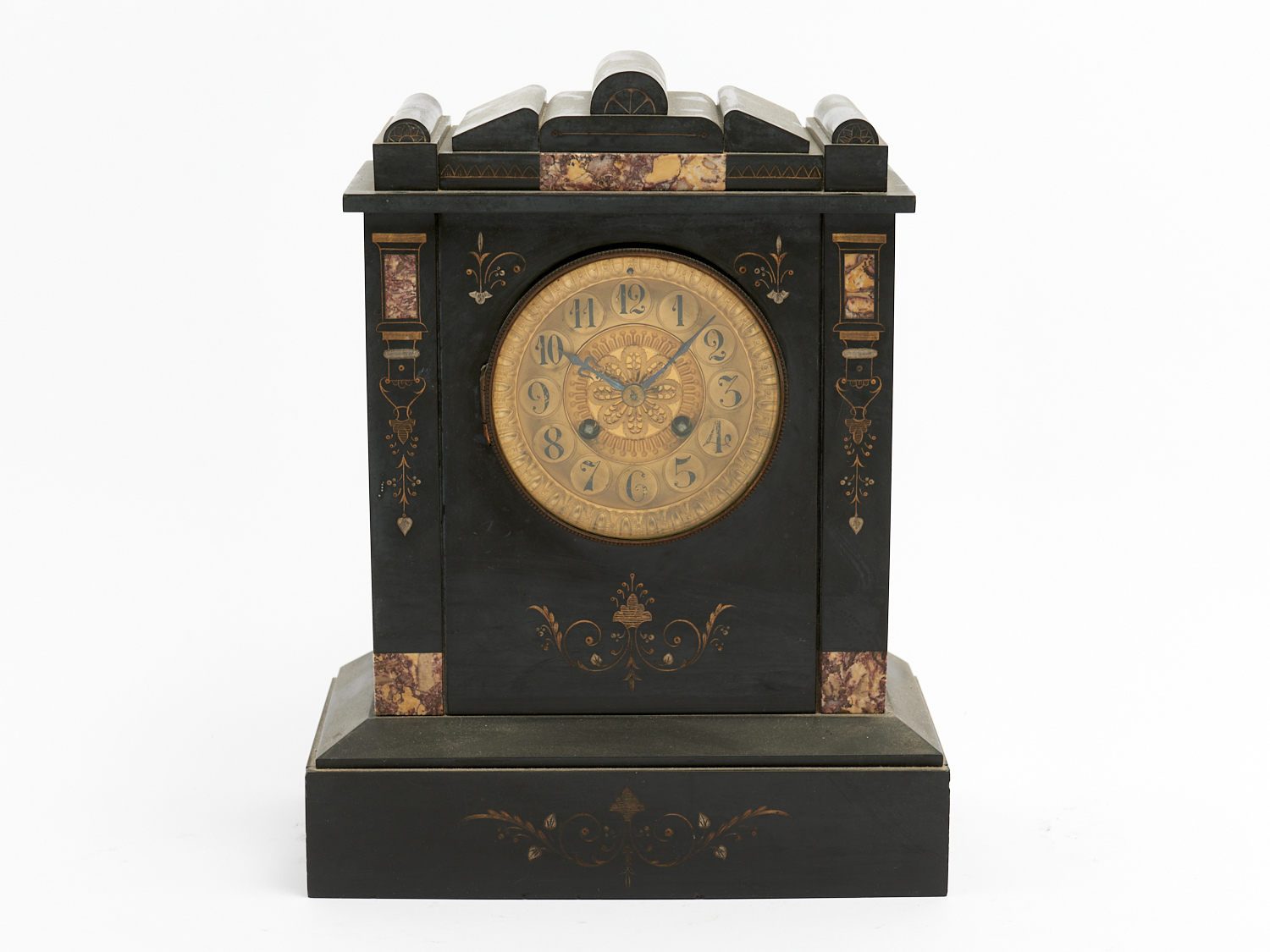 AN ANTIQUE BLACK SLATE AND MARBLE MANTLE CLOCK H.33.5CM, LEONARD JOEL DELIVERY SIZE: LARGE