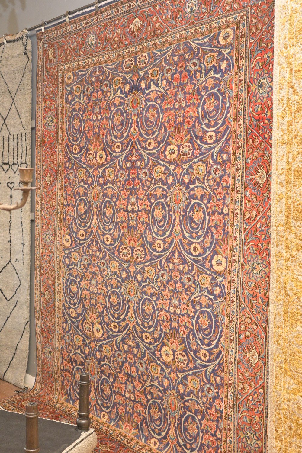 EX GALLERY, CIRCA 1970'S PERSIAN VARAMIN CARPET, 100% WOOL, NATURAL DYES, SEMI VINTAGE PILE. ALL OVER DESIGN OF ARABESQUE (ESLIMI) SCROLLS AND DANCING FLOWERS OF WILD CARNATION, PLUM BLOSSOM AND PALMETTES ON A ROYAL NAVY BLUE FIELD. BORDER IN A TERRACOTTA TONE WITH FLORAL SPRAYS, ROSETTES AND PALMETTES. SIZE: 349 X 264 CM ORIGIN: PERSIA – RRP: $4,900 DOCUMENTATION OF AUTHENTICITY INCLUDED.