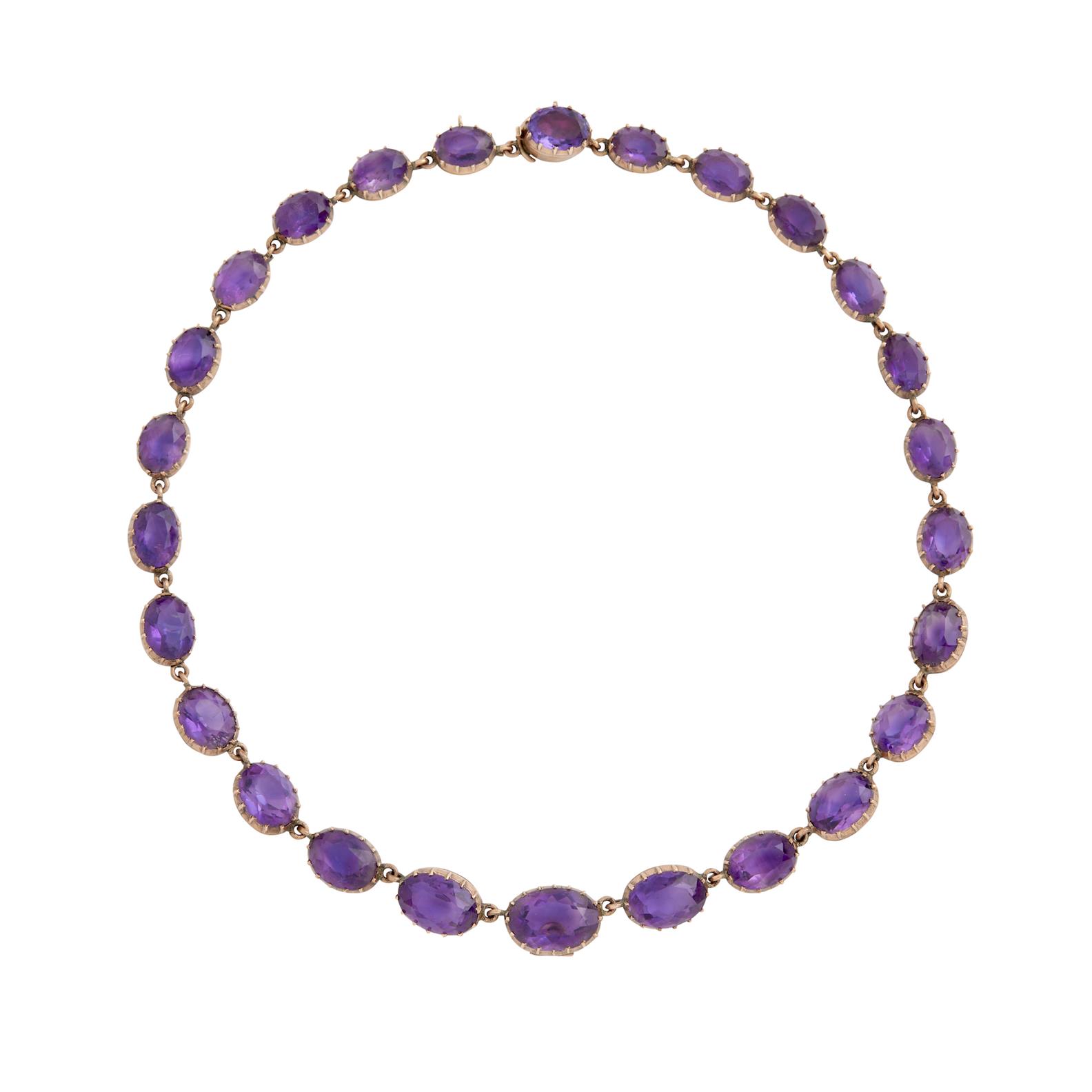 Comprising twenty-six graduating oval-cut amethysts, completed by a concealed tongue and groove clasp, mounted in rolled gold, length 360mm.