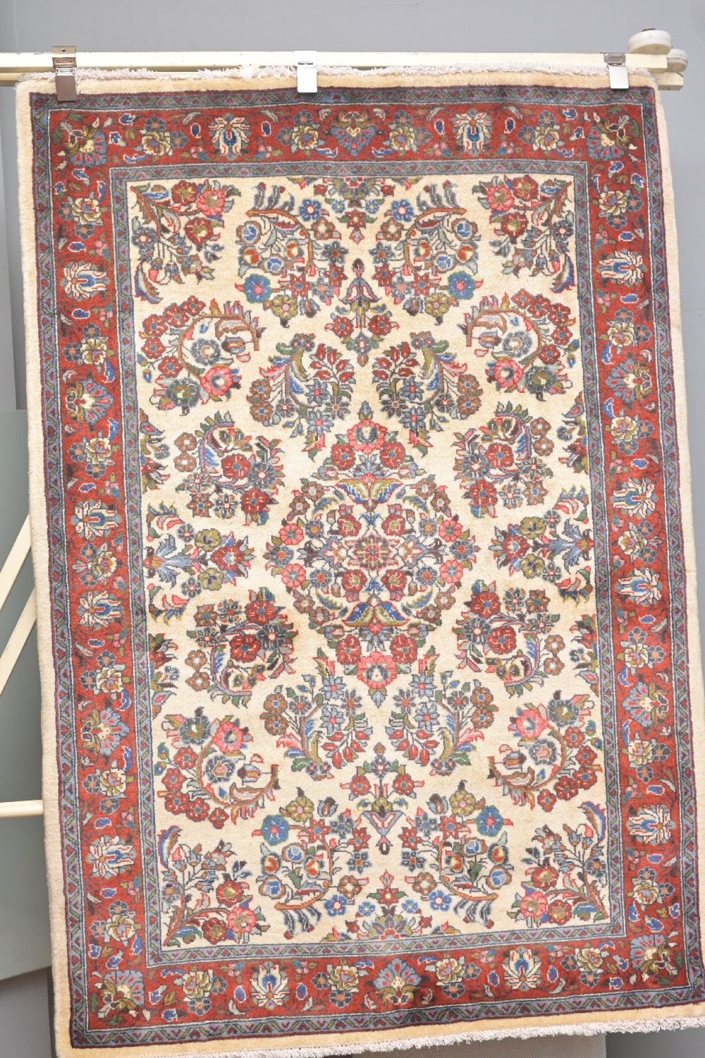 FINELY HAND-KNOTTED PERSIAN SAROUQ RUG, 100% FINE LAMB'S WOOL PILE. EX-GALLERY DISPLAYED RUG. SOLID -DENSE PLUSH PILE, WITH CLASSIC SAROUQ ALL OVER DESIGN OF BLOSSOMING FLORAL SPRAYS AND BRANCHES OF SAZ LEAVES, VASES BEARING FLOWERS ON AN IVORY FIELD. BORDER OF PALMETTES ; FLORAL SPRAYS ON A DEEP RED FIELD. SIZE: 162 X 110 CM ORIGIN: IRAN – RRP: $2,600 DOCUMENTATION OF AUTHENTICITY INCLUDED