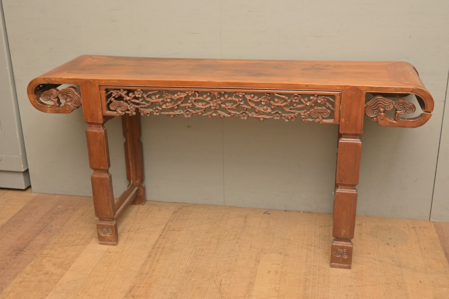 A WOODEN ALTAR TABLE WITH ORNATE CARVING (A/F) (85H X 177W X 48D CM) (LEONARD JOEL DELIVERY SIZE: X-LARGE)