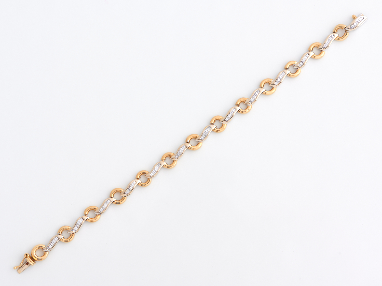 A DIAMOND BRACELET IN TWO-TONE 18CT GOLD, THE DIAMONDS TOTALLING 1.44CTS, 193MM, 21.94GMS