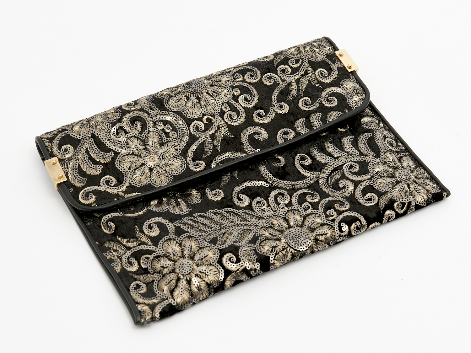 A STUART WEITZMAN CLUTCH WITH SEQUIN FLORAL DETAILING AND BLACK SUEDE INTERIOR W.28CM, LEONARD JOEL DELIVERY SIZE: SMALL