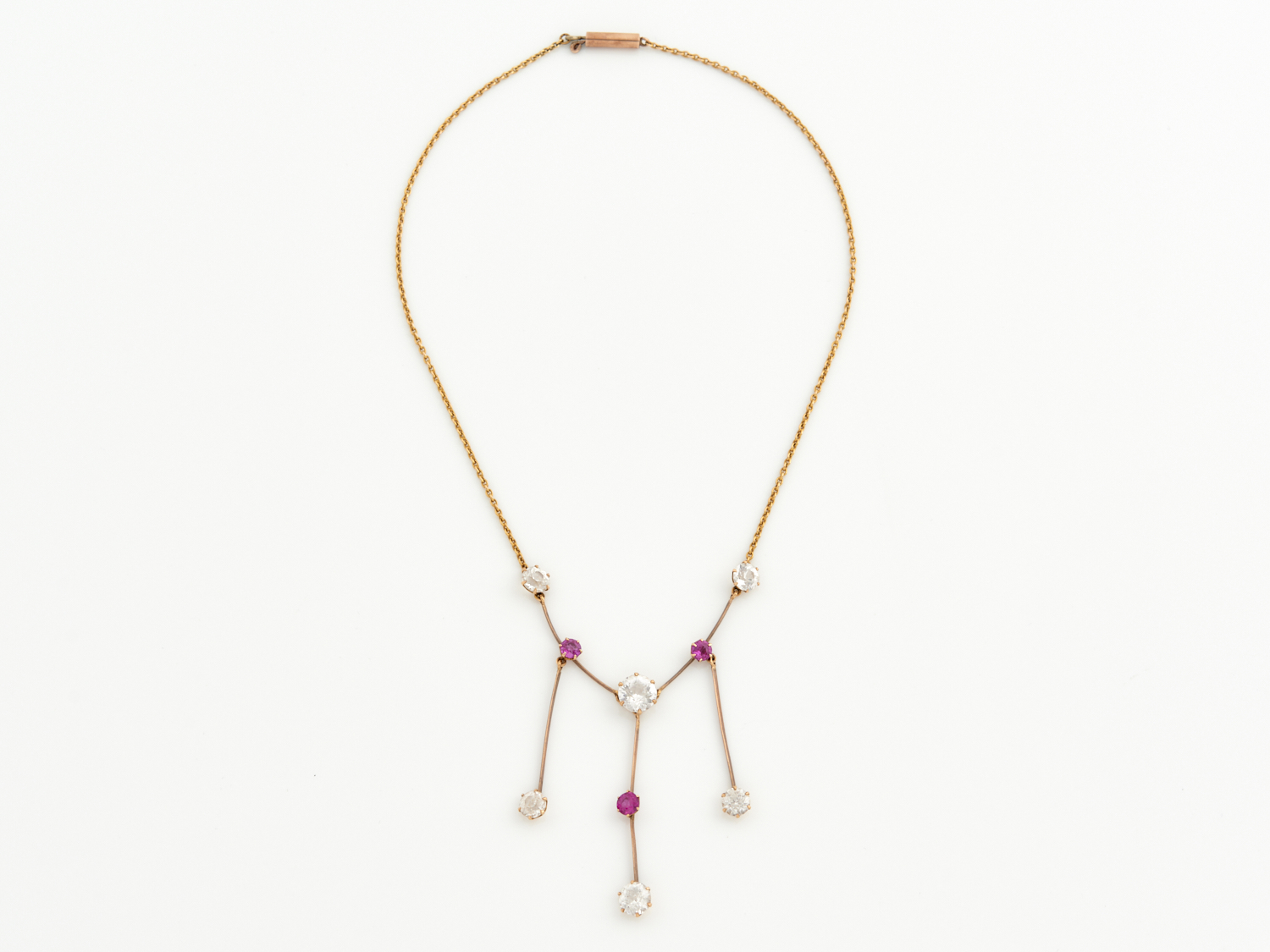 A VINTAGE SYNTHETIC WHITE AND PINK SAPPHIRE NECKLACE IN 15CT GOLD, 350MM, 6.2GMS
