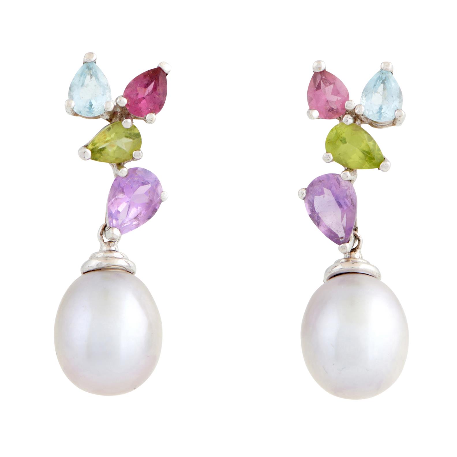 Each earring suspending an oval pearl of grey hues measuring approximately 11.30mm by 10.20mm, below a multi-gem surmount including pear-cut aquamarine, tourmaline, peridot and amethyst, to post and butterfly fittings, length 32mm.