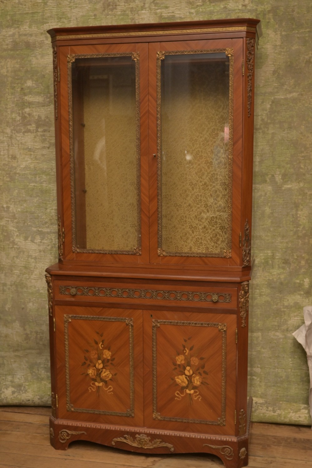 EARLY 20TH CENTURY FRENCH FRUITWOOD FLORAL DECORATED BOOKCASE CABINET WITH ORMOLU DECORATIONS TO EITHER SIDE (A/F)- MISSING SHELVES, KEY IN OFFICE (208H X 101W X 52D CM) (PLEASE NOTE THIS HEAVY ITEM MUST BE REMOVED BY CARRIERS AT THE CUSTOMER'S EXPENSE. LEONARD JOEL STAFF CANNOT ASSIST CARRYING THIS ITEM) (X-LARGE ITEM)