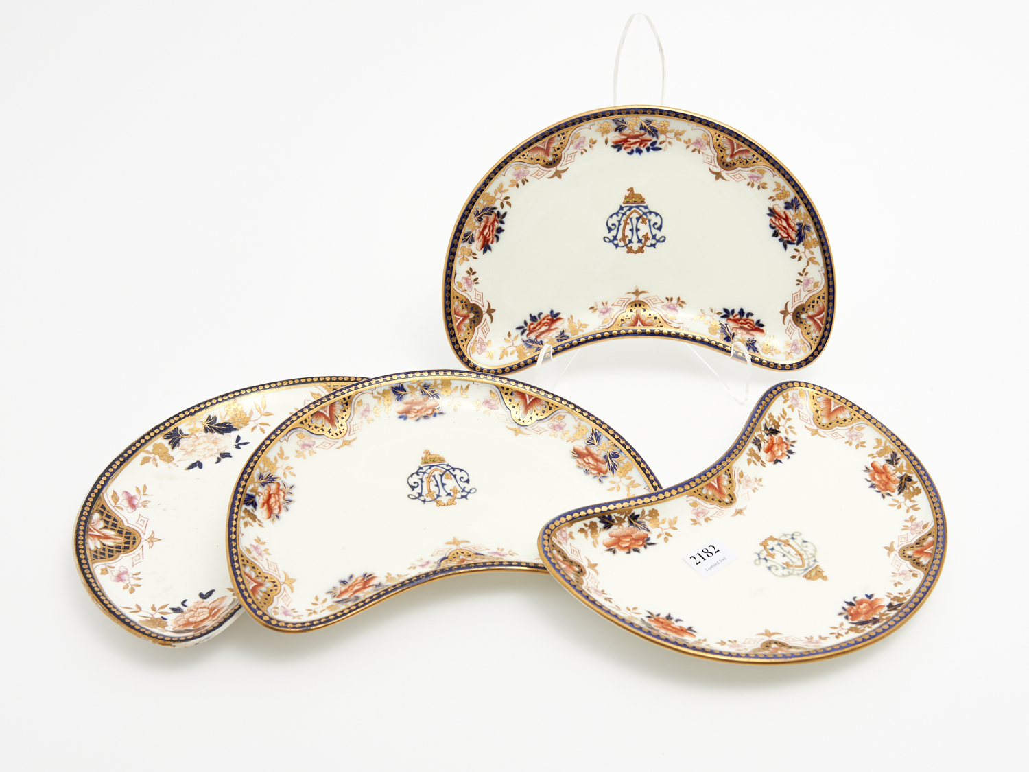 FOUR WEDGWOOD IMARI CRESCENT DISHES WITH POSSIBLY ROYAL MONOGRAM L.23.5CM, LEONARD JOEL DELIVERY SIZE: MEDIUM