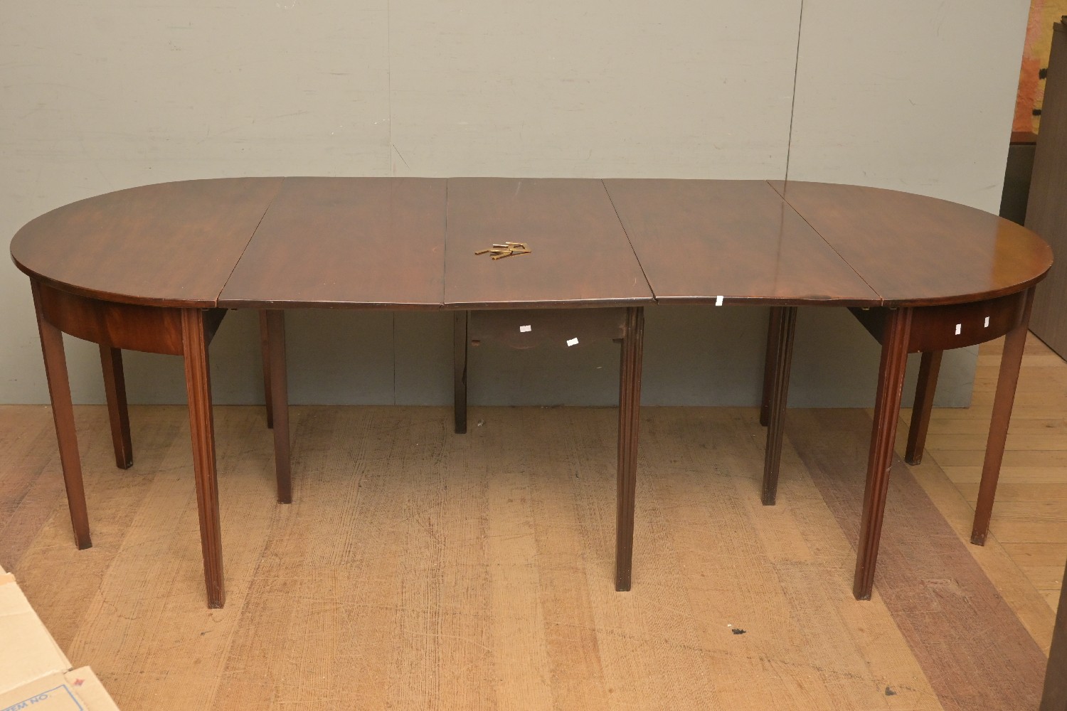 A GEORGE III MAHOGANY EXTENDING DINING TABLE (A/F) (TABLE CLIPS IN OFFICE) (72H X 240W X 107D CM) (PLEASE NOTE THIS HEAVY ITEM MUST BE REMOVED BY CARRIERS AT THE CUSTOMER'S EXPENSE. LEONARD JOEL STAFF CANNOT ASSIST CARRYING THIS ITEM) (X-LARGE ITEM)