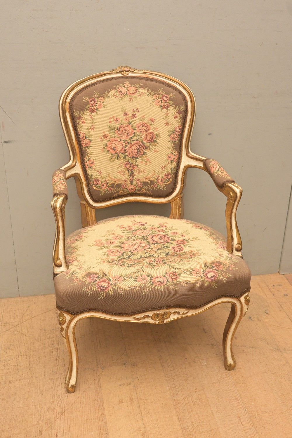 A LATE 19th CENTURY LOUIS XV-STYLE FAUTEUIL, THE WHITE-PAINTED FRAME PARCEL-GILT (A/F) (89H X 58W X 63D CM) (LEONARD JOEL DELIVERY SIZE: LARGE)