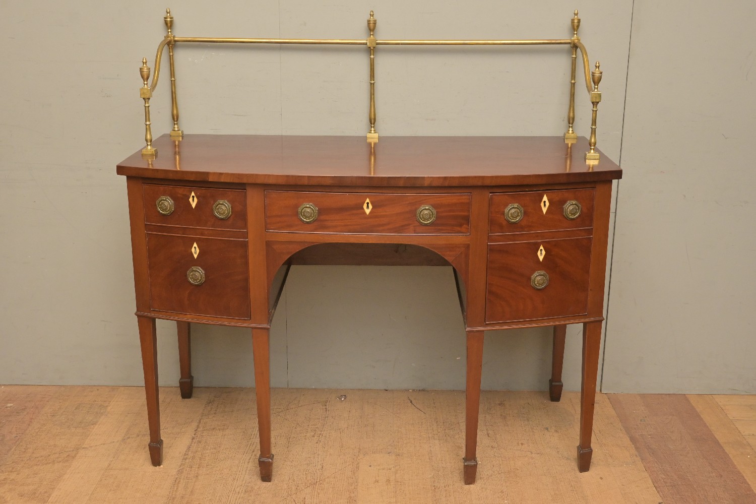 A GEORGE III MAHOGANY BOW-FRONT SIDEBOARD, WITH BRASS CURTAIN RAIL BACK (131H X 166W X 66D CM) (PLEASE NOTE THIS HEAVY ITEM MUST BE REMOVED BY CARRIERS AT THE CUSTOMER'S EXPENSE. LEONARD JOEL STAFF CANNOT ASSIST CARRYING THIS ITEM) (X-LARGE ITEM)