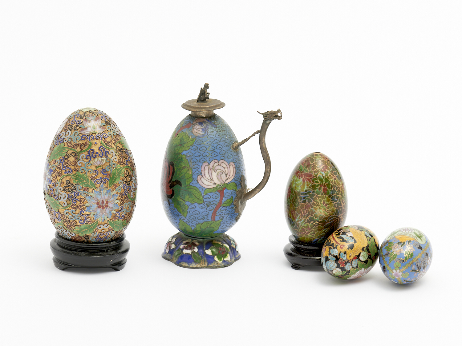 A GROUP OF CHINESE CLOISONNE EGGS TOGETHER WITH AN EGG FORM DRAGON SPOUT TEAPOT H.16CM (TALLEST) (A/F), LEONARD JOEL LOCAL DELIVERY: MEDIUM