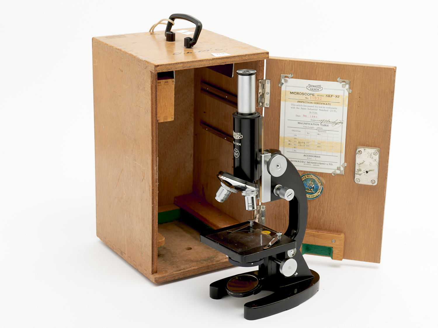 A 1950'S JAPANESE WOODEN CASED SHIMADZU MICROSCOPE WITH ADDITIONAL LENSES H.36CM (BOX), LEONARD JOEL LOCAL DELIVERY: MEDIUM