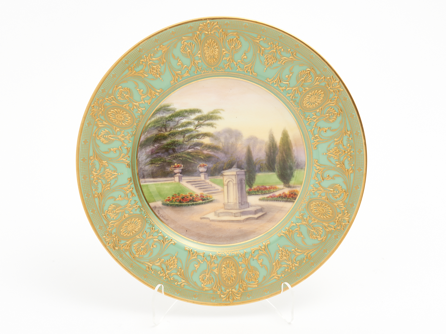 A ROYAL WORCESTER HAND PAINTED CABINET PLATE OF THE FORMAL GARDEN AT MOOR PARK HERTS, SIGNED 'R RUSHTON' DIA.26.5CM, LEONARD JOEL LOCAL DELIVERY: SMALL