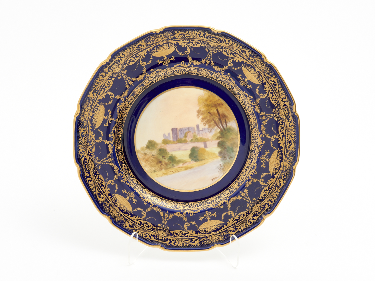 A ROYAL DOULTON HAND PAINTED CABINET PLATE OF A CASTLE SCENE WITH GILDING ON COBALT BLUE GROUND, SIGNED 'R BROWN' 26.5CM (A/F), LEONARD JOEL LOCAL DELIVERY: SMALL