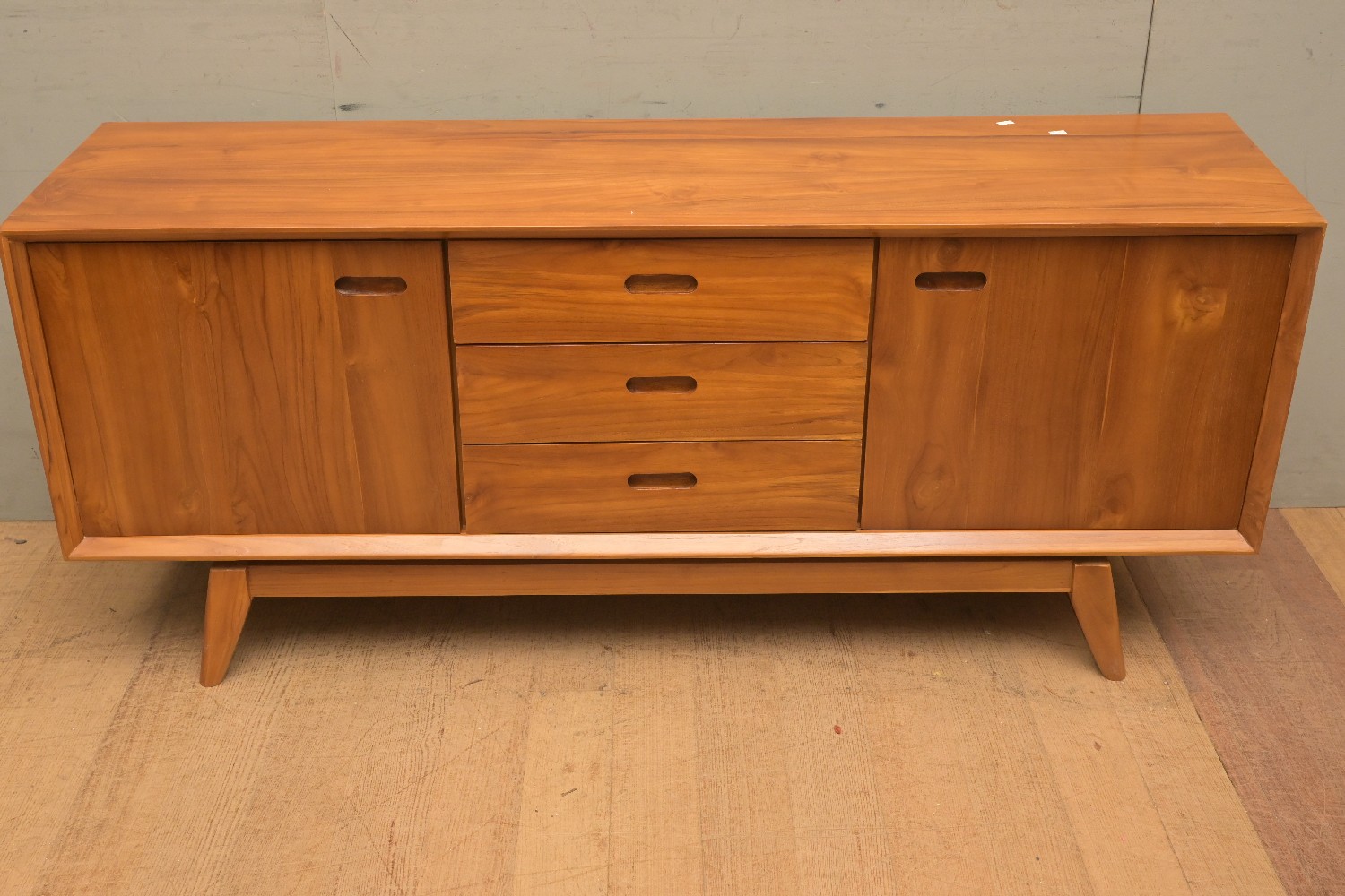 A MID-CENTURY STYLE SOLID TEAK SIDEBOARD (64H X 150W X 40D CM) (PLEASE NOTE THIS HEAVY ITEM MUST BE REMOVED BY CARRIERS AT THE CUSTOMER'S EXPENSE. LEONARD JOEL STAFF CANNOT ASSIST CARRYING THIS ITEM) (LARGE ITEM)