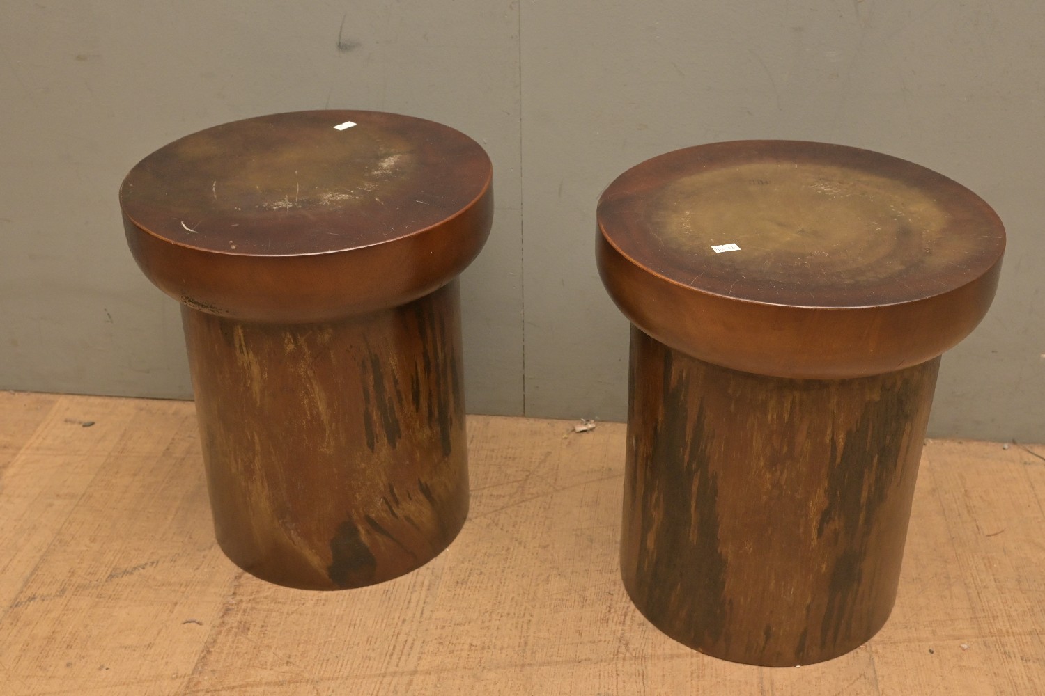 A PAIR OF SOLID TIMBER SIDE TABLES (41H X 35DIAM CM) (LEONARD JOEL DELIVERY SIZE: X-LARGE)